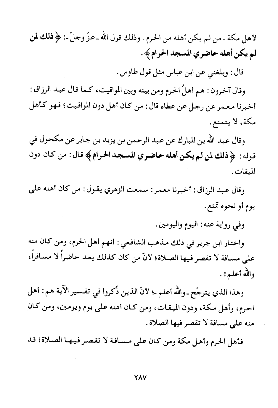 واختار ابن جرير في ذلك مذهب الشافعي: أنهم أهل الحرم، ومن كان منه على مسافة لا تقصر فيها الصلاة؛ لأنّ من كان كذلك يعد حاضراً لا مسافراً، والله أعلم".