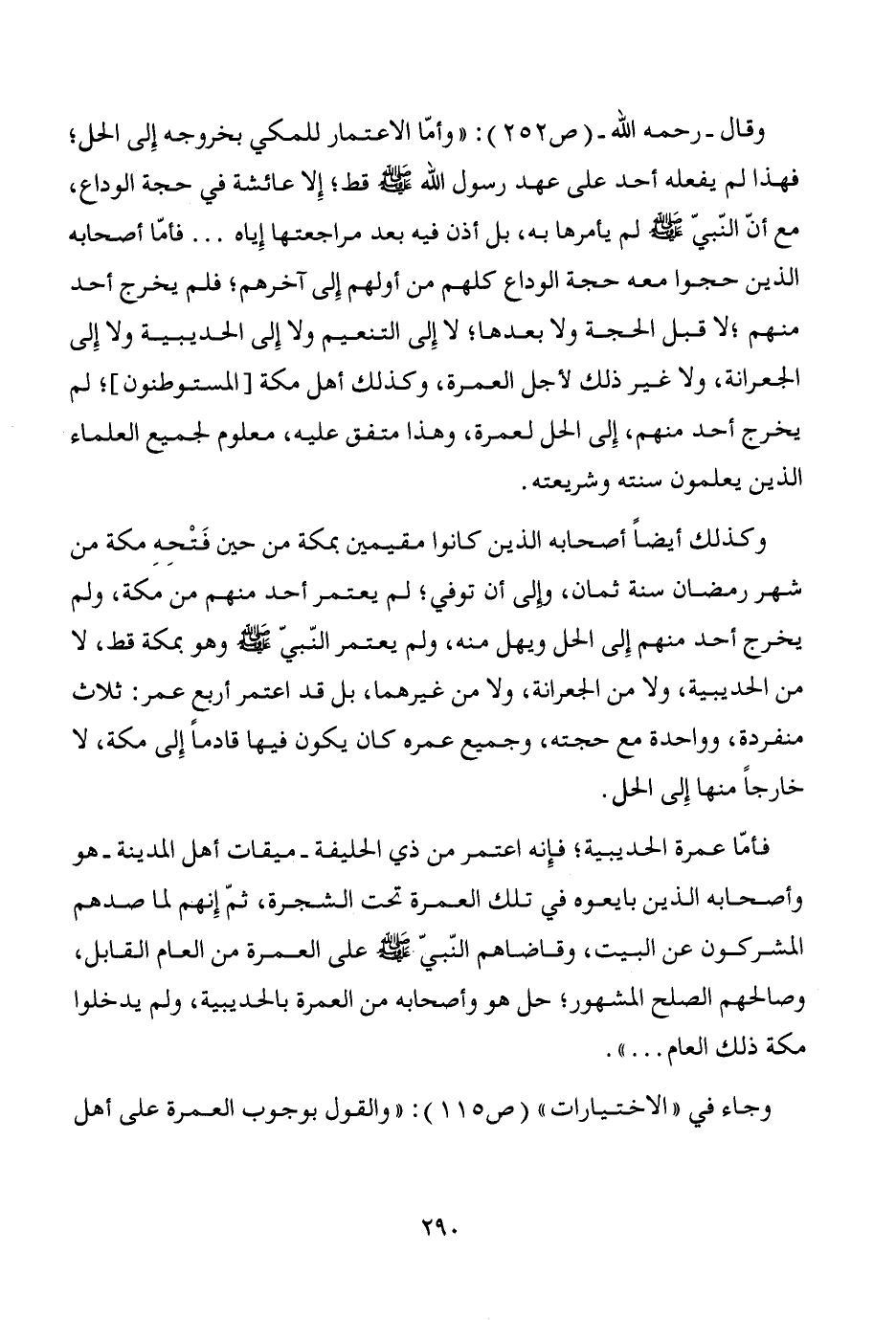 وقال -رحمه الله- (ص 252): "وأمّا الاعتمار للمكي بخروجه إِلى الحل؛ فهذا لم يفعله أحد على عهد رسول الله - صَلَّى اللَّهُ عَلَيْهِ وَسَلَّمَ -؛ إِلا عائشة في حجة الوداع، مع أنّ النّبيّ - صَلَّى اللَّهُ عَلَيْهِ وَسَلَّمَ - لم يأمرها به، بل أذن فيه بعد مراجعتها إِياه ... فأمّا أصحابه الذين حجوا معه حجة الوداع كلهم من أولهم إِلى آخرهم؛ فلم يخرج أحد منهم؛ لا قبل الحجة ولا بعدها؛ لا إِلى التنعيم ولا إِلى الحديبية ولا إِلى الجعرانة، ولا غير ذلك لأجل العمرة، وكذلك أهل مكة [المستوطنون]؛ لم يخرج أحد منهم، إِلى الحل لعمرة، وهذا متفق عليه، معلوم لجميع العلماء الذين يعلمون سنته وشريعته.