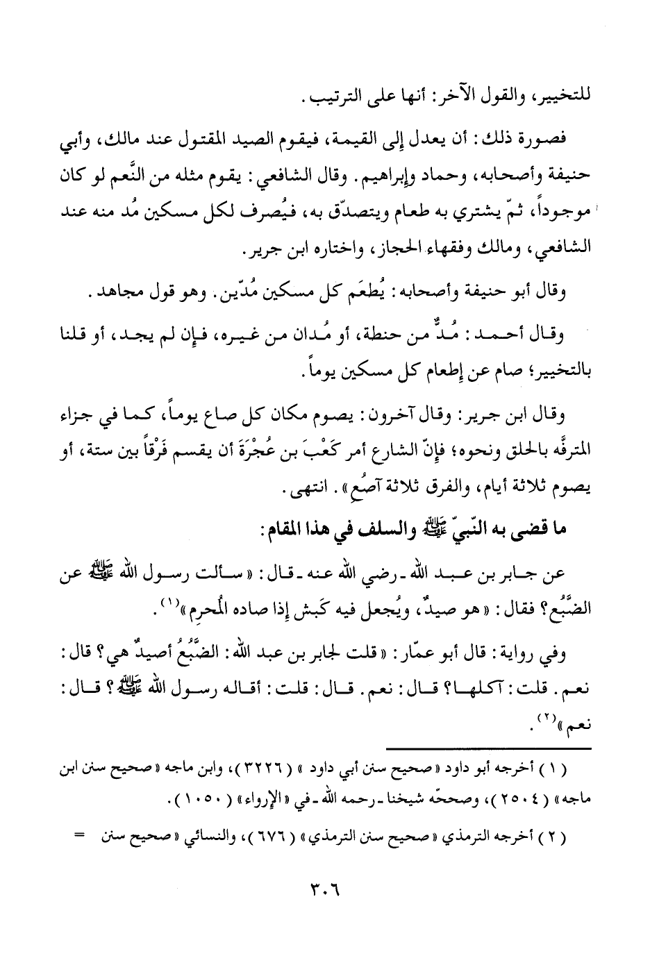 عن جابر بن عبد الله -رضي الله عنه- قال: "سألت رسول الله - صَلَّى اللَّهُ عَلَيْهِ وَسَلَّمَ - عن الضَّبُع؟ فقال: "هو صيدٌ، ويُجعل فيه كَبش إِذا صاده المُحرِم" (¬1).