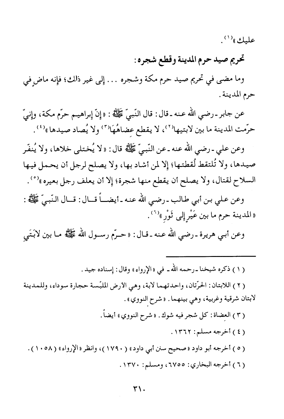 عن جابر -رضي الله عنه- قال: قال النّبيّ - صَلَّى اللَّهُ عَلَيْهِ وَسَلَّمَ -: "إِنّ إِبراهيم حرّم مكة، وإنيّ حرّمت المدينة ما بين لابتيها (¬2)، لا يقطع عِضاهُهَا (¬3) ولا يُصاد صيدها" (¬4).