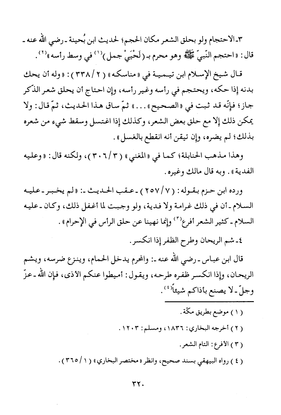 3 - الاحتجام ولو بحلق الشعر مكان الحجم؛ لحديث ابن بُحينة -رضي الله عنه- قال: "احتجم النّبيّ - صَلَّى اللَّهُ عَلَيْهِ وَسَلَّمَ - وهو محرم بـ (لَحْيَيْ جمل) (¬1) في وسط رأسه" (¬2).