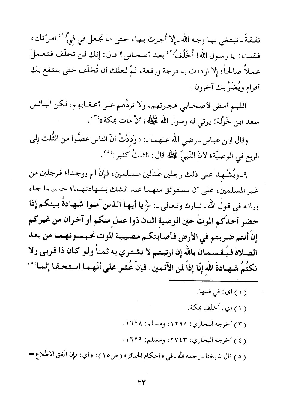 9 - ويُشْهِد على ذلك رجلين عَدْلين مسلمين، فإِنْ لم يوجدا؛ فرجلين من غير المسلمين، على أن يستوثق منهما عند الشك بشهادتهما؛ حسبما جاء بيانه في قول الله -تبارك وتعالى-: {يا أيها الذين آمنوا شهادةُ بينكم إِذا حضر أحدَكم الموتُ حين الوصيةِ اثنان ذوا عدلٍ منكم أو آخران من غيركم إِنْ أنتم ضربتم في الأرض فأصابتكم مصيبة الموت تحبسونهما من بعد الصلاة فيُقسمان بالله إِن ارتبتم لا نشتري به ثمناً ولو كان ذا قربى ولا نكْتُمُ شهادةَ اللهِ إِنّا إِذاً لمن الآثمين * فإِنْ عُثر على أنّهما استحقا إثماً (¬5)