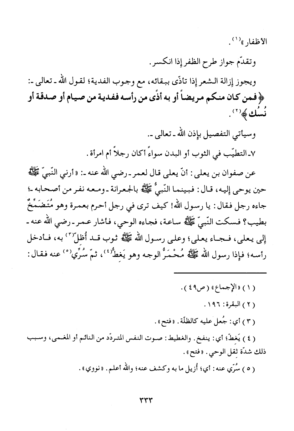 ويجوز إِزالة الشعر إِذا تأذّى ببقائه، مع وجوب الفدية؛ لقول الله -تعالى-: {فمن كان منكم مريضاً أو به أذًى من رأسه ففدية من صيام أو صدقة أو نُسُك} (¬2).