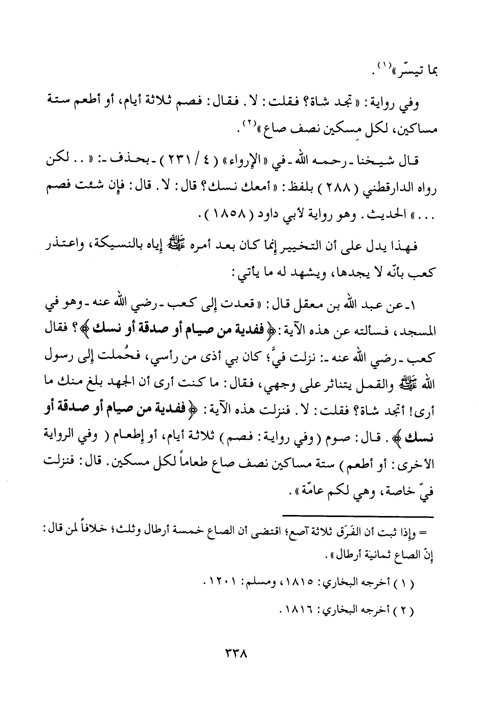 فهذا يدل على أن التخيير إِنما كان بعد أمره - صَلَّى اللَّهُ عَلَيْهِ وَسَلَّمَ - إِياه بالنسيكة، واعتذر كعب بأنّه لا يجدها، ويشهد له ما يأتي:
