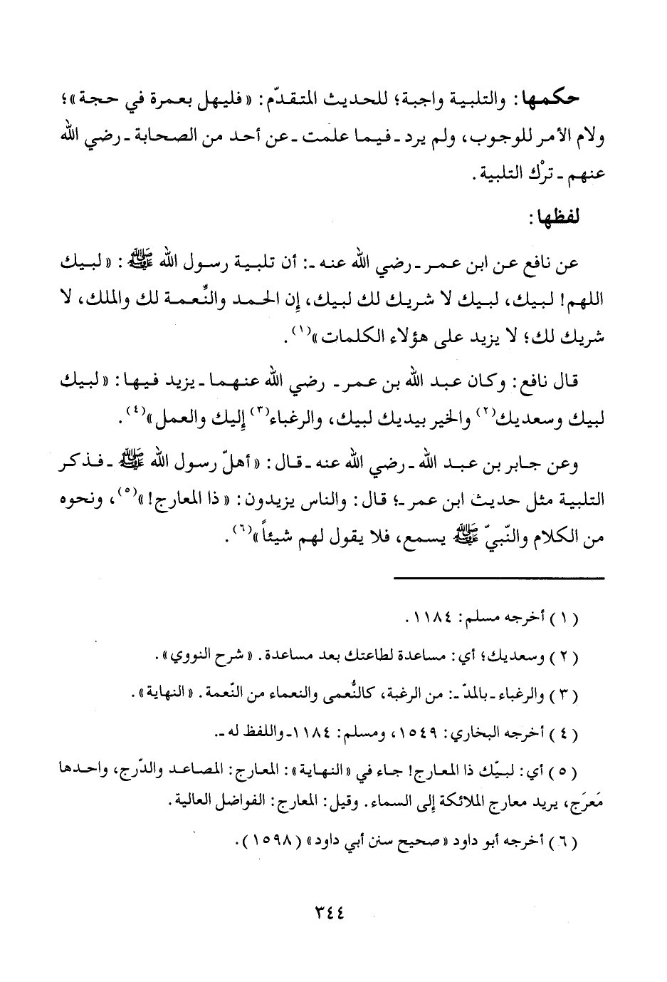 عن نافع عن ابن عمر -رضي الله عنه-: أن تلبية رسول الله - صَلَّى اللَّهُ عَلَيْهِ وَسَلَّمَ -: "لبيك اللهم! لبيك، لبيك لا شريك لك لبيك، إِن الحمد والنِّعمة لك والملك، لا شريك لك؛ لا يزيد على هؤلاء الكلمات" (¬1).