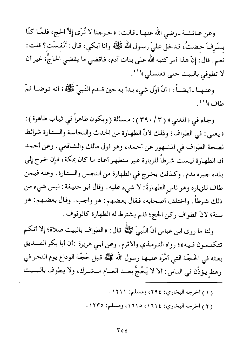 وعن عائشة -رضي الله عنها- قالت: "خرجنا لا نُرَى إلاَّ الحج، فلمّا كنا بِسَرِفَ حِضتُ، فدخل عليّ رسول الله - صَلَّى اللَّهُ عَلَيْهِ وَسَلَّمَ - وأنا أبكي، قال: أَنَفِسْتِ؟ قلت: نعم. قال: إِنّ هذا أمر كتبه الله على بنات آدم، فاقضي ما يقضي الحاجُّ؛ غير أن لا تطوفي بالبيت حتى تغتسلي" (¬1).