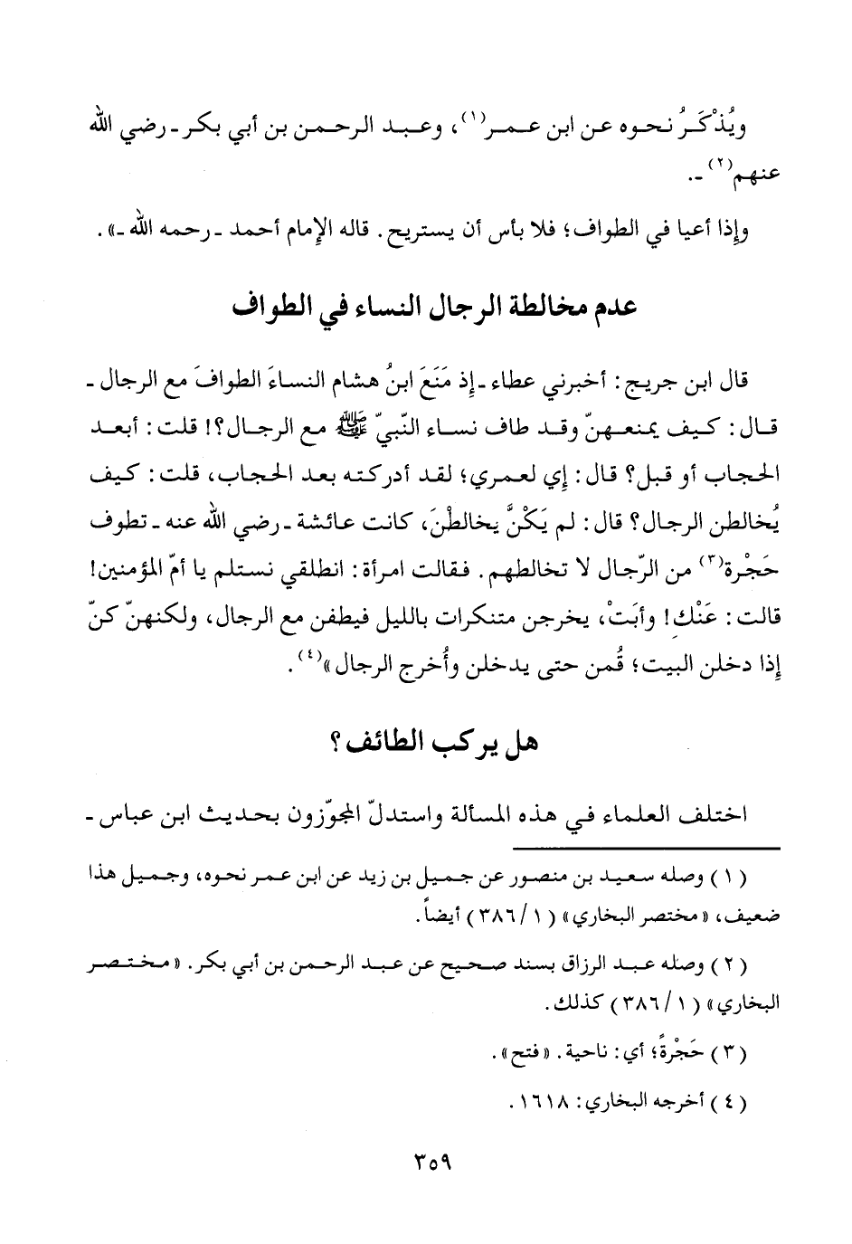 قال ابن جريج: أخبرني عطاء -إِذ مَنَعَ ابنُ هشام النساءَ الطوافَ مع الرجال- قال: كيف يمنعهنّ وقد طاف نساء النّبيّ - صَلَّى اللَّهُ عَلَيْهِ وَسَلَّمَ - مع الرجال؟! قلت: أبعد الحجاب أو قبل؟ قال: إِي لعمري؛ لقد أدركته بعد الحجاب، قلت: كيف يُخالطن الرجال؟ قال: لم يَكْنَّ يخالطْنَ، كانت عائشة -رضي الله عنه- تطوف حَجْرة (¬3) من الرّجال لا تخالطهم. فقالت امرأة: انطلقي نستلم يا أمّ المؤمنين! قالت: عَنْكِ! وأبَتْ، يخرجن متنكرات بالليل فيطفن مع الرجال، ولكنهنّ كنّ إِذا دخلن البيت؟ قُمن حتى يدخلن وأُخرج الرجال" (¬4).