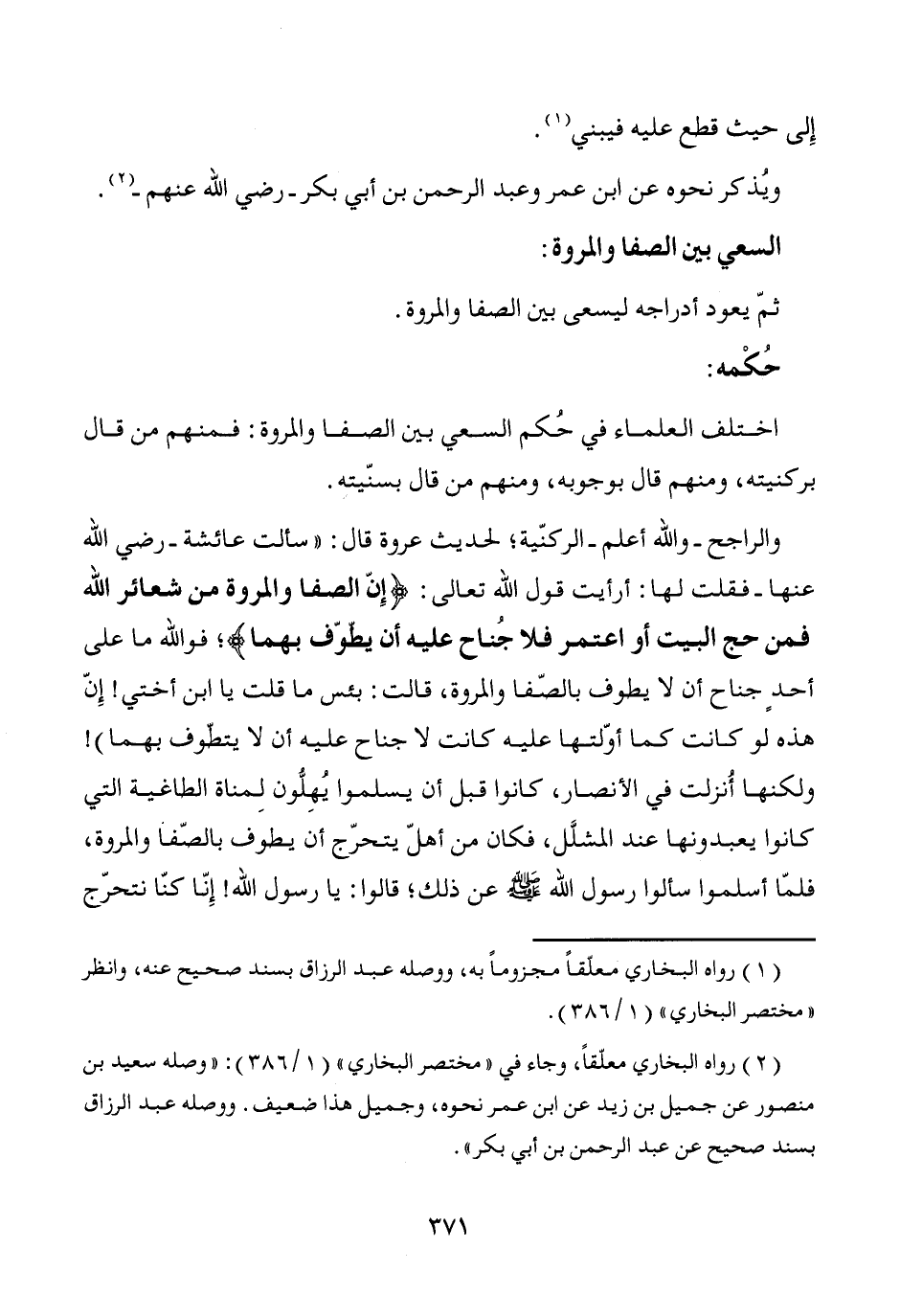 والراجح -والله أعلم- الركنّية؛ لحديث عروة قال: "سألت عائشة -رضي الله عنها- فقلت لها: أرأيت قول الله تعالى: {إِنّ الصفا والمروة من شعائر الله فمن حج البيت أو اعتمر فلا جُناح عليه أن يطوّف بهما}؛ فوالله ما على أحدٍ جناح أن لا يطوف بالصّفا والمروة، قالت: بئس ما قلت يا ابن أختي! إِنّ هذه لو كانت كما أوّلتها عليه كانت لا جناح عليه أن لا يتطّوف بهما)! ولكنها أُنزلت في الأنصار، كانوا قبل أن يسلموا يُهِلُّون لِمناة الطاغية التي كانوا يعبدونها عند المشلَّل، فكان من أهلّ يتحرّج أن يطوف بالصّفا والمروة، فلمّا أسلموا سألوا رسول الله - صَلَّى اللَّهُ عَلَيْهِ وَسَلَّمَ - عن ذلك؛ قالوا: يا رسول الله! إِنّا كنّا نتحرّج