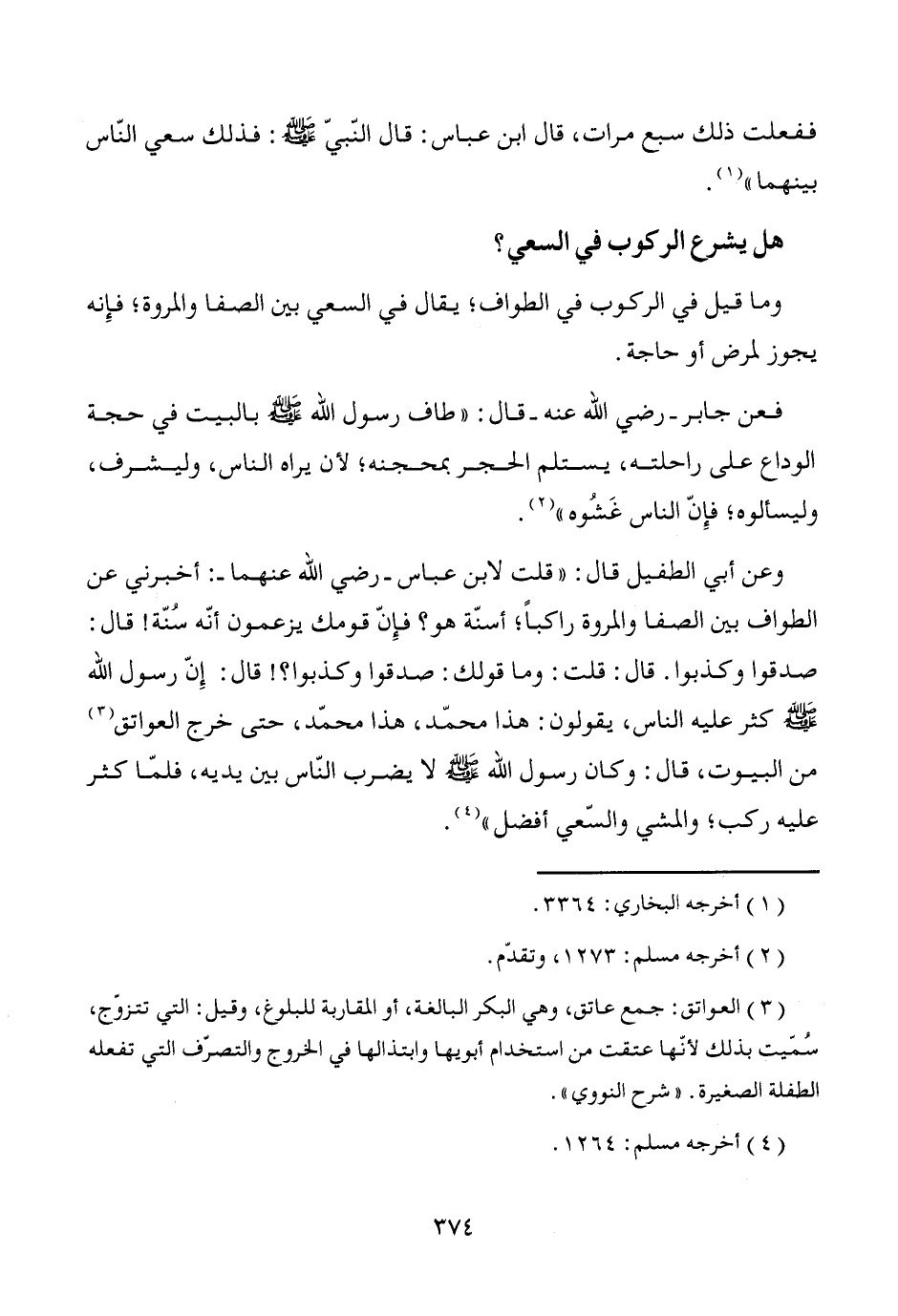 وعن أبي الطفيل قال: "قلت لابن عباس -رضي الله عنهما-: أخبرني عن الطواف بين الصفا والمروة راكباً؛ أسنّة هو؟ فإِنّ قومك يزعمون أنّه سُنّة! قال: صدقوا وكذبوا. قال: قلت: وما قولك: صدقوا وكذبوا؟! قال: إِنّ رسول الله - صَلَّى اللَّهُ عَلَيْهِ وَسَلَّمَ - كثر عليه الناس، يقولون: هذا محمّد، هذا محمّد، حتى خرج العواتق (¬3) من البيوت، قال: وكان رسول الله - صَلَّى اللَّهُ عَلَيْهِ وَسَلَّمَ - لا يضرب النّاس بين يديه، فلمّا كثر عليه ركب؛ والمشي والسّعي أفضل" (¬4).