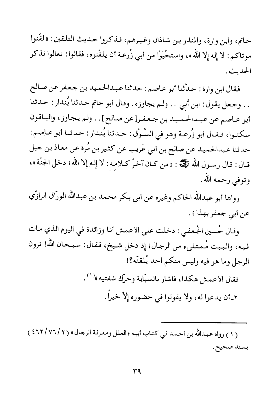 حاتم، وابن وارة، والمنذر بن شاذان وغيرهم، فذكروا حديث التلقين: "لقّنوا موتاكم: لا إله إِلا الله"، واستحْيَوْا من أبي زُرعة أن يلقّنوه، فقالوا: تعالوا نذكر الحديث.