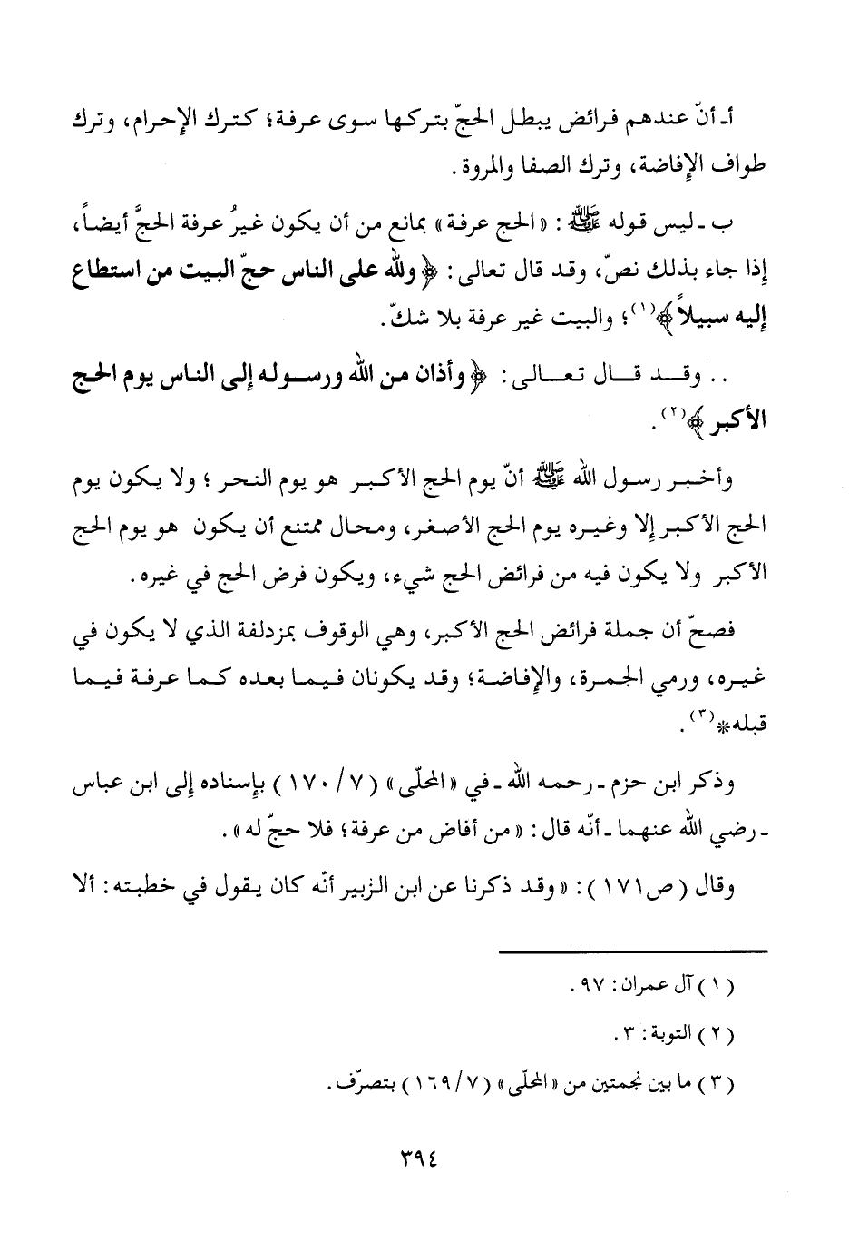 ب- ليس قوله - صَلَّى اللَّهُ عَلَيْهِ وَسَلَّمَ -: "الحج عرفة" بمانع من أن يكون غيرُ عرفة الحجَّ أيضاً، إِذا جاء بذلك نصّ، وقد قال تعالى: {ولله على الناس حجّ البيت من استطاع إِليه سبيلاً} (¬1)؛ والبيت غير عرفة بلا شكّ.