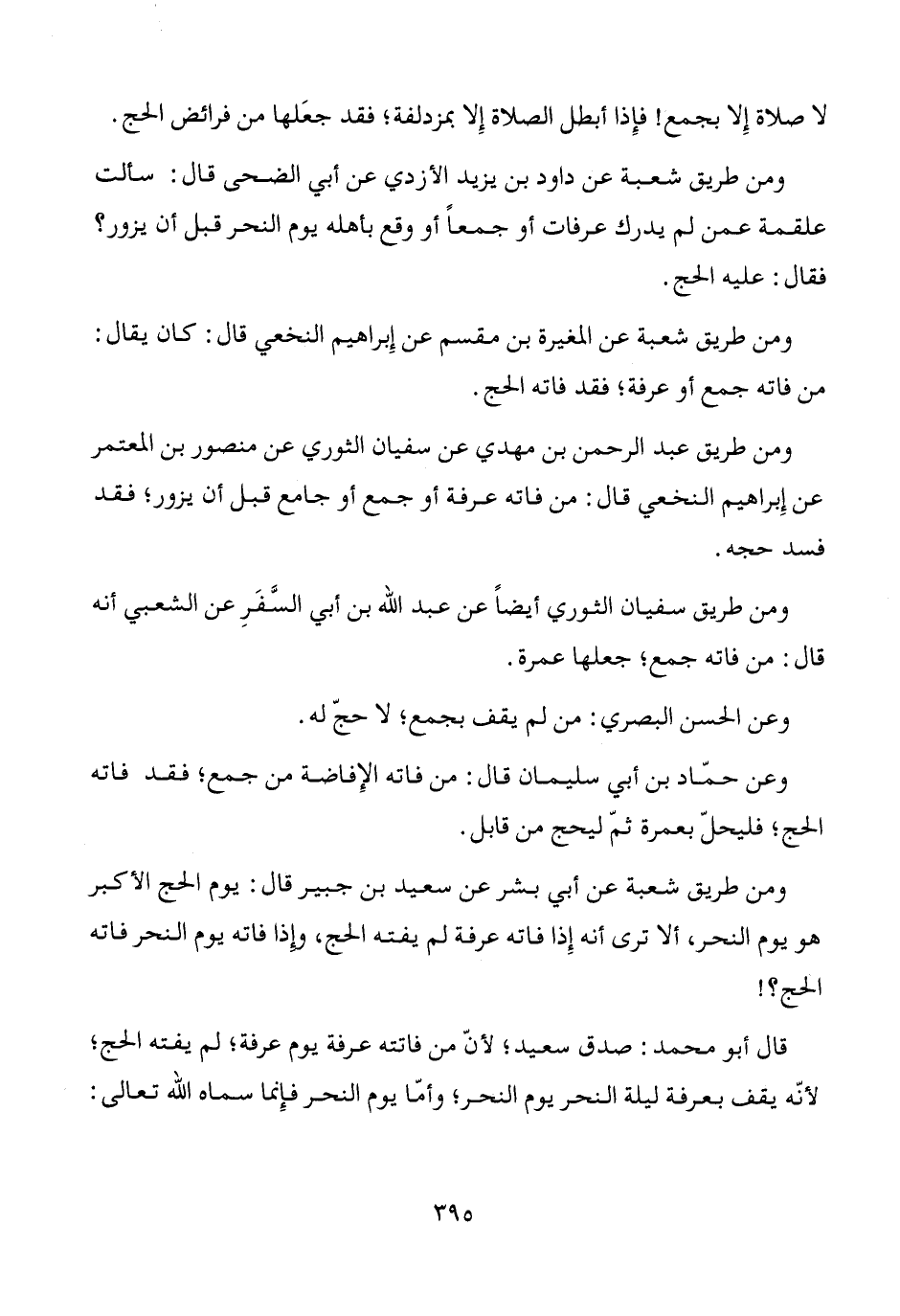 ومن طريق شعبة عن المغيرة بن مقسم عن إِبراهيم النخعي قال: كان يقال: من فاته جمع أو عرفة؛ فقد فاته الحج.