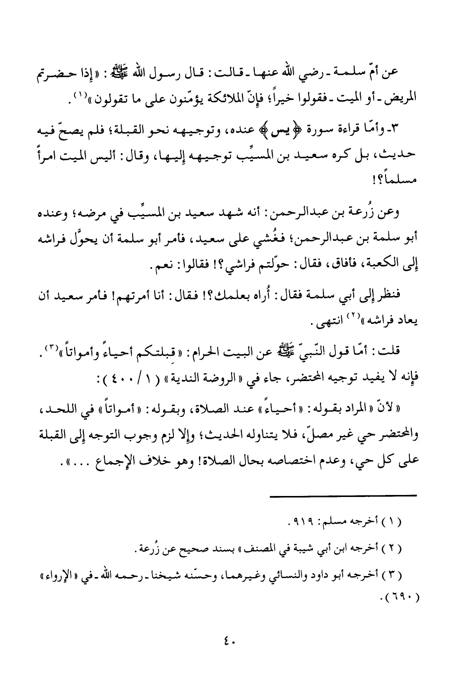 قلت: أمّا قول النّبيّ - صَلَّى اللَّهُ عَلَيْهِ وَسَلَّمَ - عن البيت الحرام: "قِبلتكم أحياءً وأمواتاً" (¬3). فإِنه لا يفيد توجيه المحتضر، جاء في "الروضة الندية" (1/ 400):