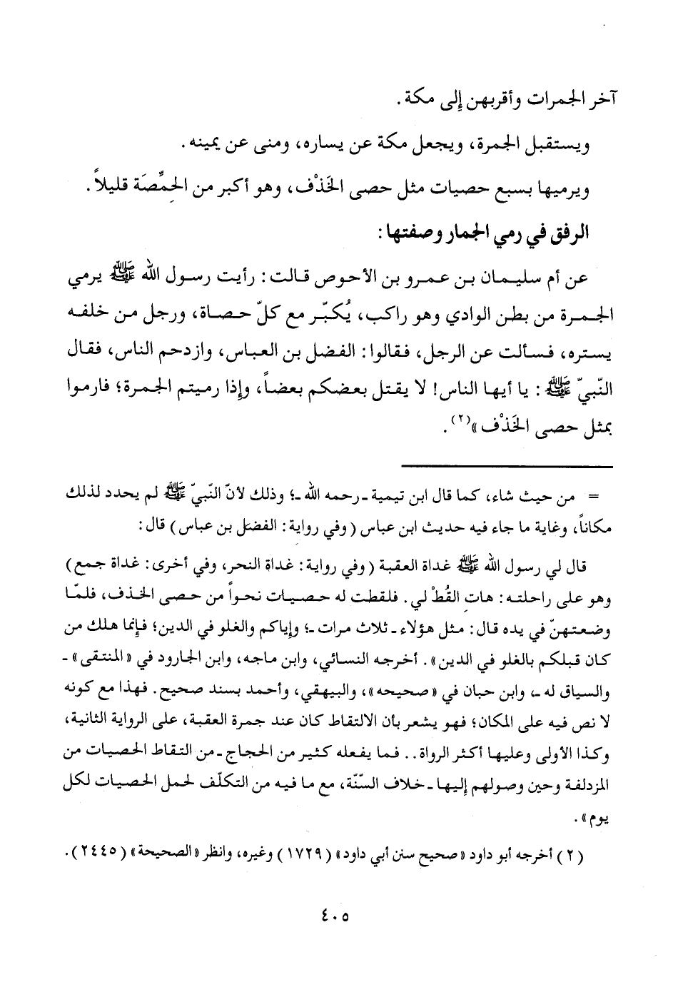 عن أم سليمان بن عمرو بن الأحوص قالت: رأيت رسول الله - صَلَّى اللَّهُ عَلَيْهِ وَسَلَّمَ - يرمي الجمرة من بطن الوادي وهو راكب، يُكبّر مع كلّ حصاة، ورجل من خلفه يستره، فسألت عن الرجل، فقالوا: الفضل بن العباس، وازدحم الناس، فقال النّبيّ - صَلَّى اللَّهُ عَلَيْهِ وَسَلَّمَ -: يا أيها الناس! لا يقتل بعضكم بعضاً، وإذا رميتم الجمرة؛ فارموا بمثل حصى الخَذْف" (¬2).