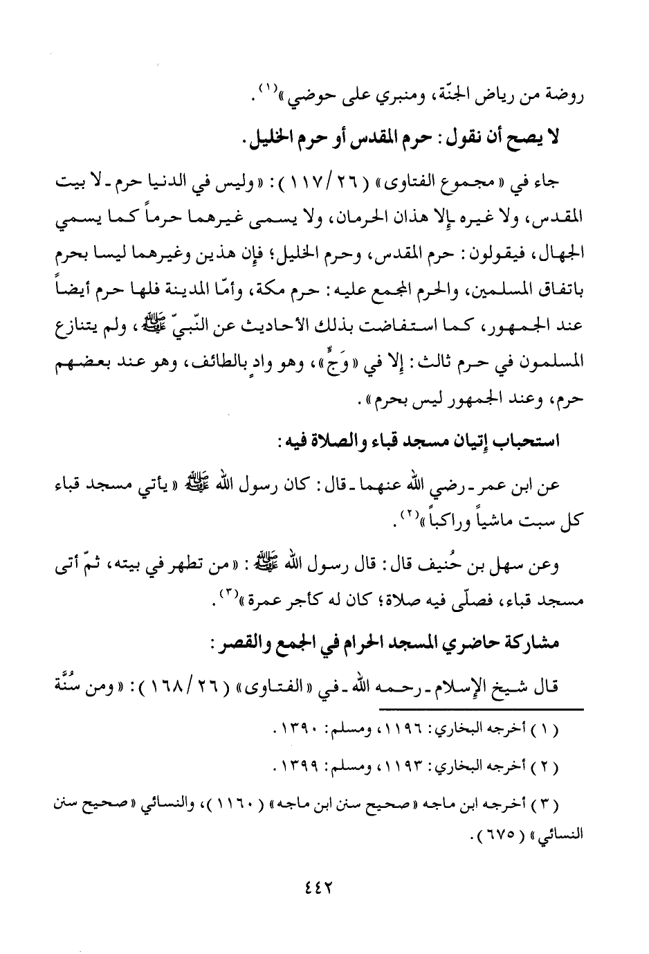 جاء في "مجموع الفتاوى" (26/ 117): "وليس في الدنيا حرم -لا بيت المقدس، ولا غيره إلاَّ هذان الحرمان، ولا يسمى غيرهما حرماً كما يسمي الجهال، فيقولون: حرم المقدس، وحرم الخليل؛ فإِن هذين وغيرهما ليسا بحرم باتفاق المسلمين، والحرم المجمع عليه: حرم مكة، وأمّا المدينة فلها حرم أيضاً عند الجمهور، كما استفاضت بذلك الأحاديث عن النّبيّ - صَلَّى اللَّهُ عَلَيْهِ وَسَلَّمَ -، ولم يتنازع المسلمون في حرم ثالث: إِلا في "وَجٍّ"، وهو وادٍ بالطائف، وهو عند بعضهم حرم، وعند الجمهور ليس بحرم".