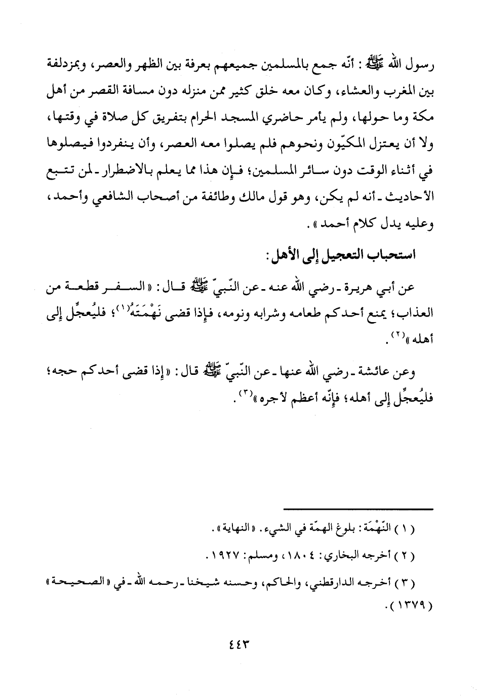 عن أبي هريرة -رضي الله عنه- عن النّبيّ - صَلَّى اللَّهُ عَلَيْهِ وَسَلَّمَ - قال: "السفر قطعة من العذاب؛ يمنع أحدكم طعامه وشرابه ونومه، فإِذا قضى نَهْمَتَهُ (¬1)؛ فليُعجِّل إِلى أهله" (¬2).