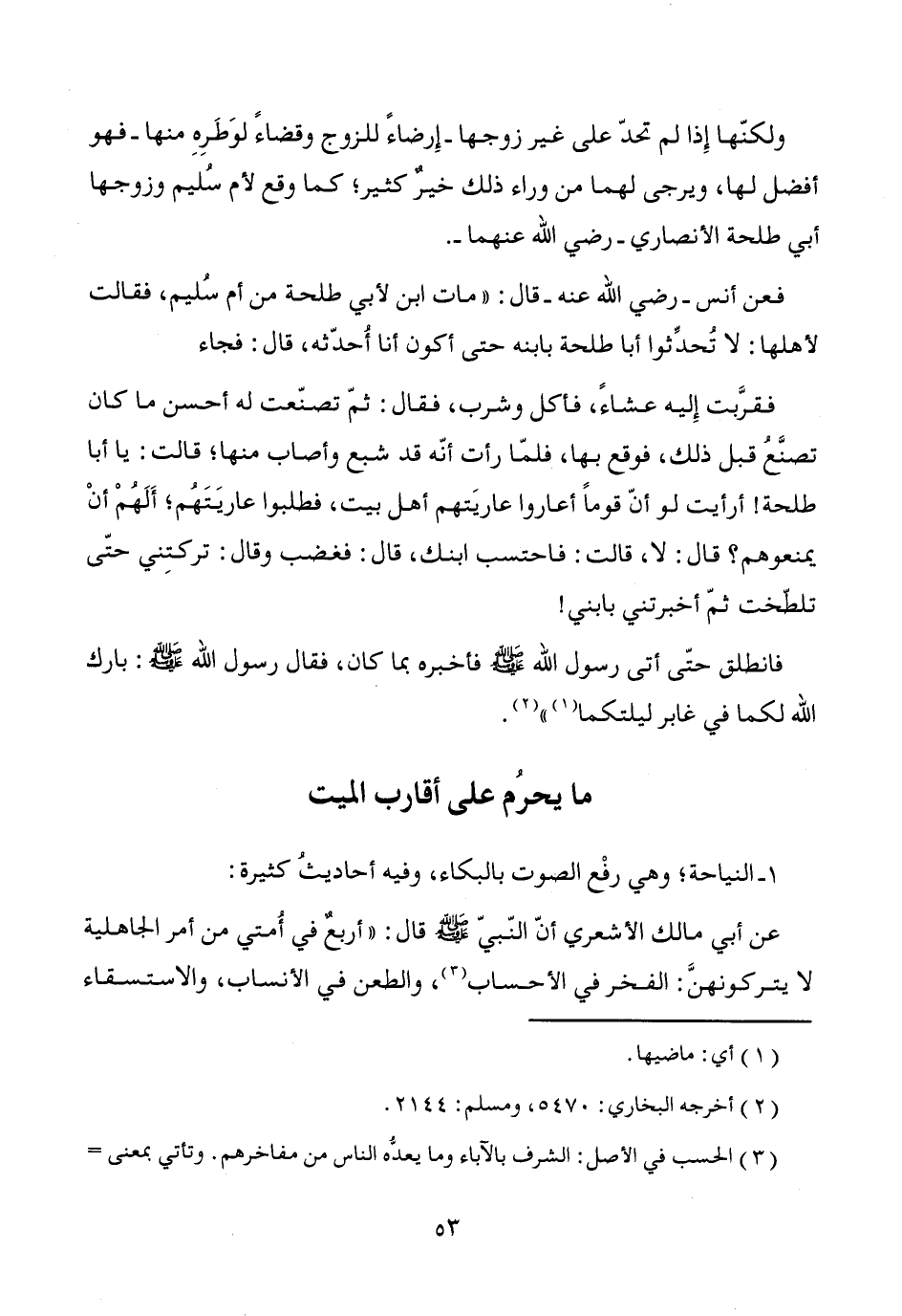 فعن أنس -رضي الله عنه- قال: "مات ابن لأبي طلحة من أم سُليم، فقالت لأهلها: لا تُحدِّثوا أبا طلحة بابنه حتى أكون أنا أُحدّثه، قال: فجاء