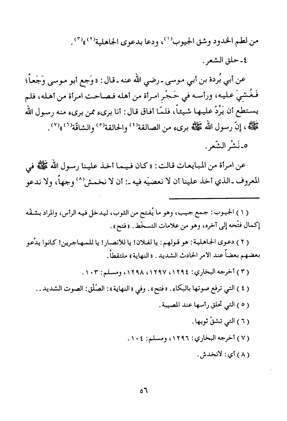 عن أبي بُردة بن أبي موسى -رضي الله عنه- قال: "وَجِع أبو موسى وَجَعاً؛ فَغُشِيَ عليه، ورأسه في حَجْرِ امرأة من أهله فصاحت امرأة من أهله، فلم يستطع أن يَرُدّ عليها شيئاً، فلمّا أفاق قال: أنا بريء ممن بريء منه رسول الله - صَلَّى اللَّهُ عَلَيْهِ وَسَلَّمَ -، إِنّ رسول الله - صَلَّى اللَّهُ عَلَيْهِ وَسَلَّمَ - بريء من الصالقة (¬4) والحالقة (¬5) والشاقّة (¬6) " (¬7).