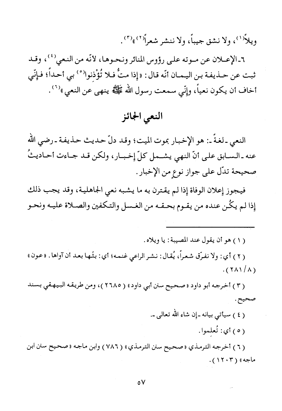 6 - الإِعلان عن موته على رؤوس المنائر ونحوها، لأنّه من النعي (¬4)، وقد ثبت عن حذيفة بن اليمان أنّه قال: "إِذا متُّ فلا تُؤْذِنوا (¬5) بي أحداً؛ فإِنّي أخاف أن يكون نعياً، وإِنّي سمعت رسول الله - صَلَّى اللَّهُ عَلَيْهِ وَسَلَّمَ - ينهى عن النعي" (¬6).