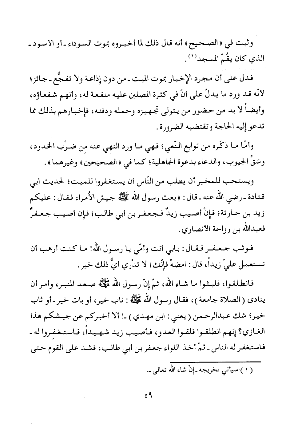 فانطلقوا، فلبثوا ما شاء الله، ثمّ إِنّ رسول الله - صَلَّى اللَّهُ عَلَيْهِ وَسَلَّمَ - صعد المنبر، وأمر أن ينادى (الصلاة جامعة)، فقال رسول الله - صَلَّى اللَّهُ عَلَيْهِ وَسَلَّمَ -: ناب خير، أو بات خير -أو ثاب خير؛ شك عبد الرحمن (يعني: ابن مهدي) -! ألا أخبركم عن جيشكم هذا الغازي؟ إِنهم انطلقوا فلقوا العدو، فأصيب زيد شهيداً، فاستغفِروا له - فاستغفر له الناس- ثمّ أخذ اللواء جعفر بن أبي طالب، فشد على القوم حتى