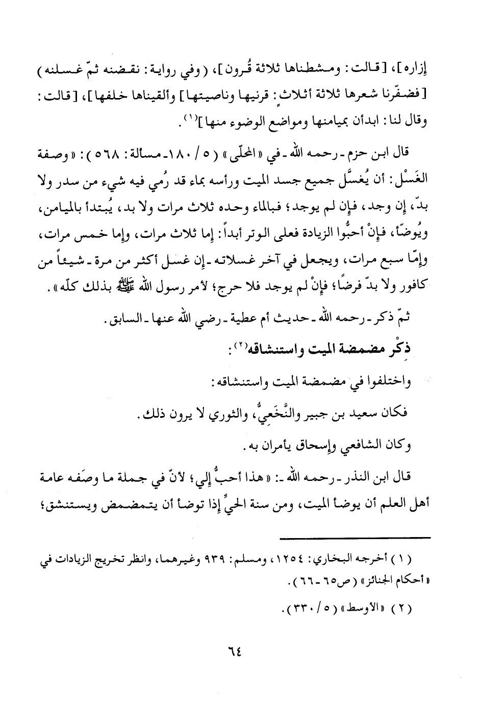 قال ابن النذر -رحمه الله-: "هذا أحبُّ إِلي؛ لأنّ في جملة ما وصَفه عامة أهل العلم أن يوضأ الميت، ومن سنة الحيِّ إِذا توضأ أن يتمضمض ويستنشق؛