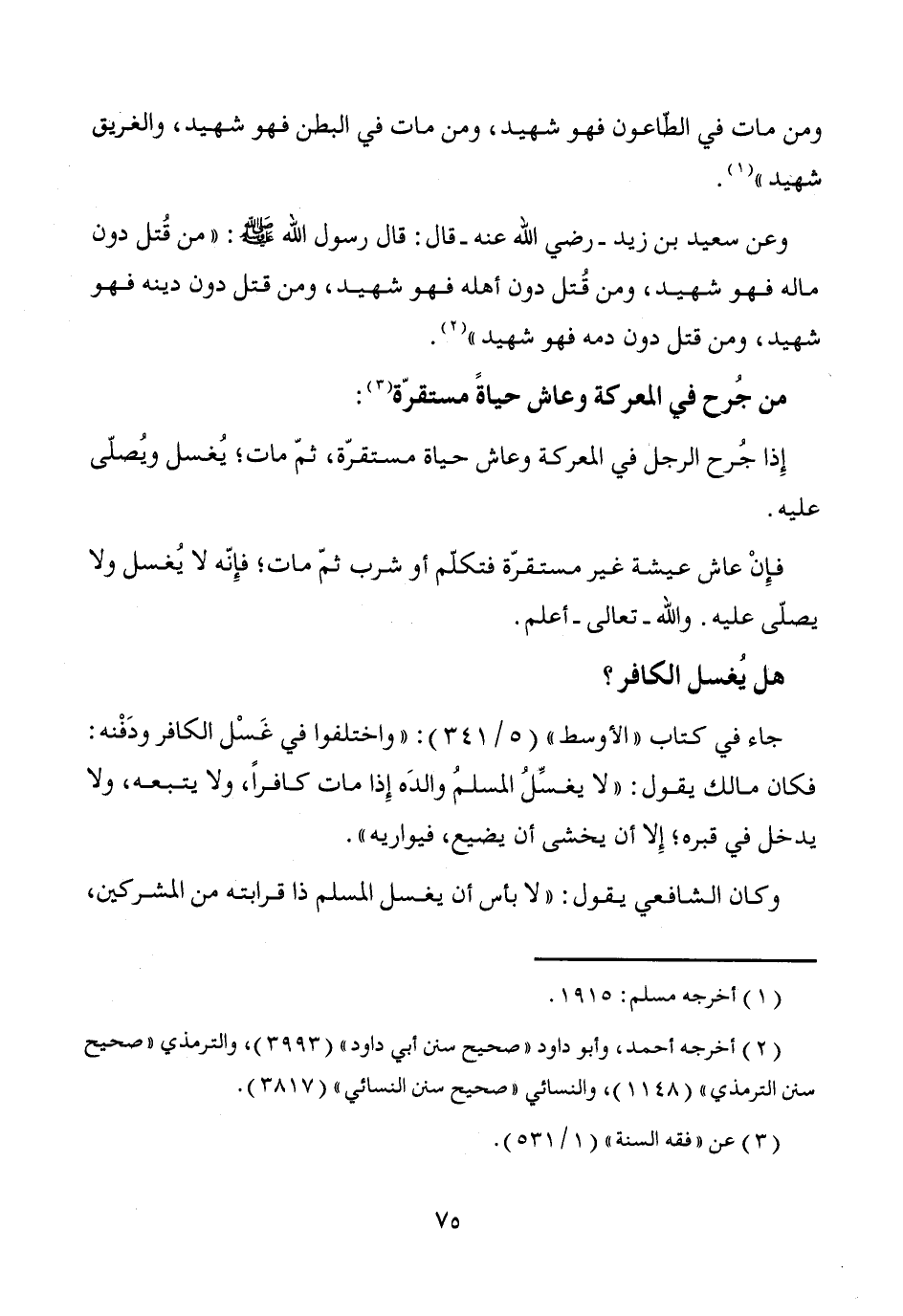 إِذا جُرح الرجل في المعركة وعاش حياة مستقرّة، ثمّ مات؛ يُغسل ويُصلّى عليه.