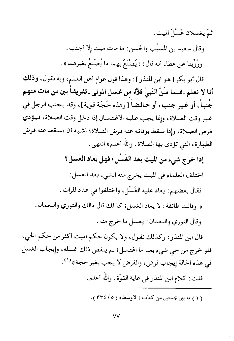 قال أبو بكر [هو ابن المنذر]: وهذا قول عوام أهل العلم، وبه نقول، وذلك أنا لا نعلم -فيما سَنّ النّبيّ - صَلَّى اللَّهُ عَلَيْهِ وَسَلَّمَ - مِن غسل الموتى- تفريقاً بين من مات منهم جُنباً، أو غير جنب، أو حائضاً [وهذه حُجّة قوية]، وقد يجنب الرجل في غير وقت الصلاة، وإِنما يجب عليه الاغتسال إِذا دخل وقت الصلاة، فيؤدي فرض الصلاة، وإذا سقط بوفاته عنه فرض الصلاة؛ أشبه أن يسقط عنه فرض الطهارة، التي تؤدى بها الصلاة. والله أعلم" انتهى.