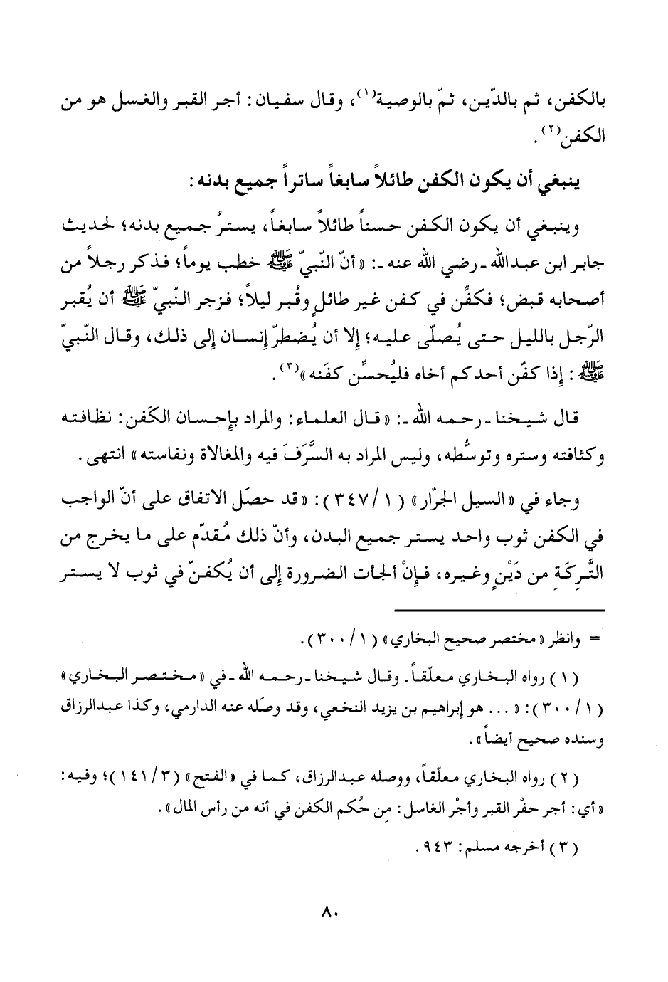 وينبغي أن يكون الكفن حسناً طائلاً سابغاً، يسترُ جميع بدنه؛ لحديث جابر ابن عبد الله -رضي الله عنه-: "أنّ النّبيّ - صَلَّى اللَّهُ عَلَيْهِ وَسَلَّمَ - خطب يوماً؛ فذكر رجلاً من أصحابه قبض؛ فكفِّن في كفن غير طائلٍ وقُبر ليلاً؛ فزجر النّبيّ - صَلَّى اللَّهُ عَلَيْهِ وَسَلَّمَ - أن يُقبر الرّجل بالليل حتى يُصلّى عليه؛ إِلا أن يُضطرّ إِنسان إِلى ذلك، وقال النّبيّ - صَلَّى اللَّهُ عَلَيْهِ وَسَلَّمَ -: إِذا كفّن أحدكم أخاه فليُحسِّن كفَنه" (¬3).