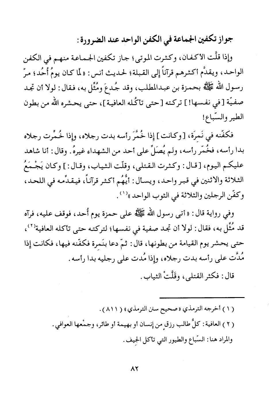 وإذا قلَّت الأكفان، وكثرت الموتى؛ جاز تكفين الجماعة منهم في الكفن الواحد، ويقدَّم أكثرهم قرآناً إِلى القبلة؛ لحديث أنس: "لمّا كان يومُ أُحُد؛ مرّ رسول الله - صَلَّى اللَّهُ عَلَيْهِ وَسَلَّمَ - بحمزة بن عبد المطلب، وقد جُدِعَ ومُثِّل به، فقال: لولا أن تجد صفيّة [في نفسها!] تركته [حتى تأكُله العافية]، حتى يحشره الله من بطون الطير والسّباع!