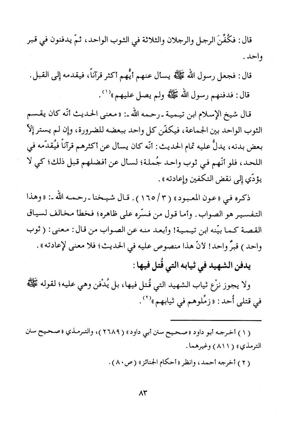 ذكره في "عون المعبود" (3/ 165). قال شيخنا -رحمه الله-: "وهذا التفسير هو الصواب. وأما قول من فسّره على ظاهره؛ فخطأ مخالف لسياق القصة كما بيّنه ابن تيمية! وأبعد منه عن الصواب من قال: معنى: (ثوب واحد) قبرٌ واحد! لأنّ هذا منصوص عليه في الحديث؛ فلا معنى لإِعادته".
