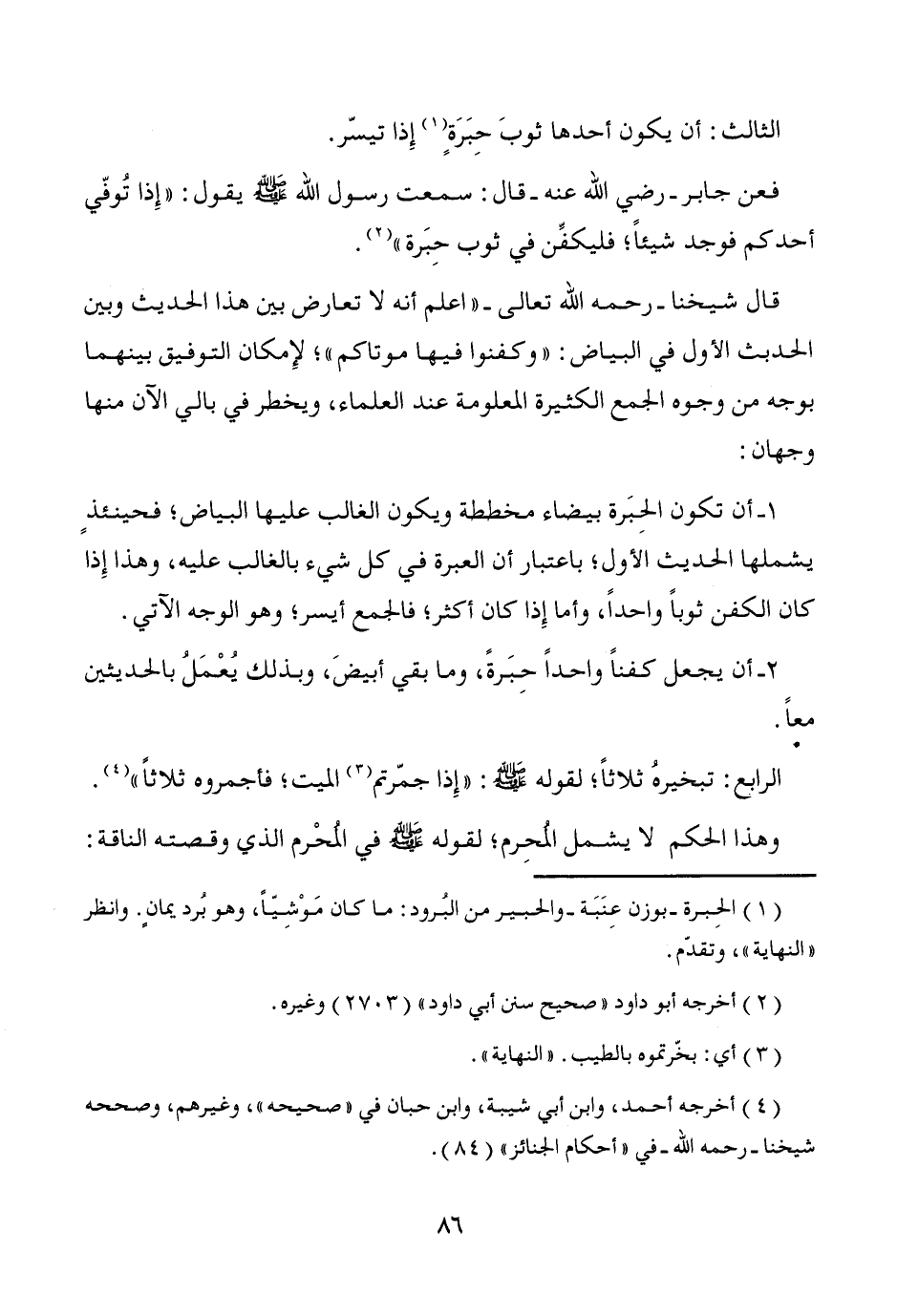 1 - أن تكون الحِبَرة بيضاء مخططة ويكون الغالب عليها البياض؛ فحينئذٍ يشملها الحديث الأول؛ باعتبار أن العبرة في كل شيء بالغالب عليه، وهذا إِذا كان الكفن ثوباً واحداً، وأما إِذا كان أكثر؛ فالجمع أيسر؛ وهو الوجه الآتي.