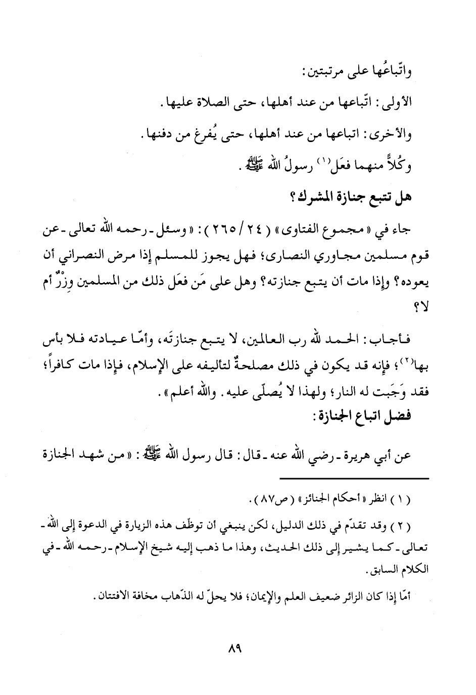 فأجاب: الحمد لله رب العالمين، لا يتبع جنازتَه، وأمّا عيادته فلا بأس بها (¬2)؛ فإِنه قد يكون في ذلك مصلحةٌ لتأليفه على الإِسلام، فإِذا مات كافراً؛ فقد وَجَبت له النار؛ ولهذا لا يُصلّى عليه. والله أعلم".