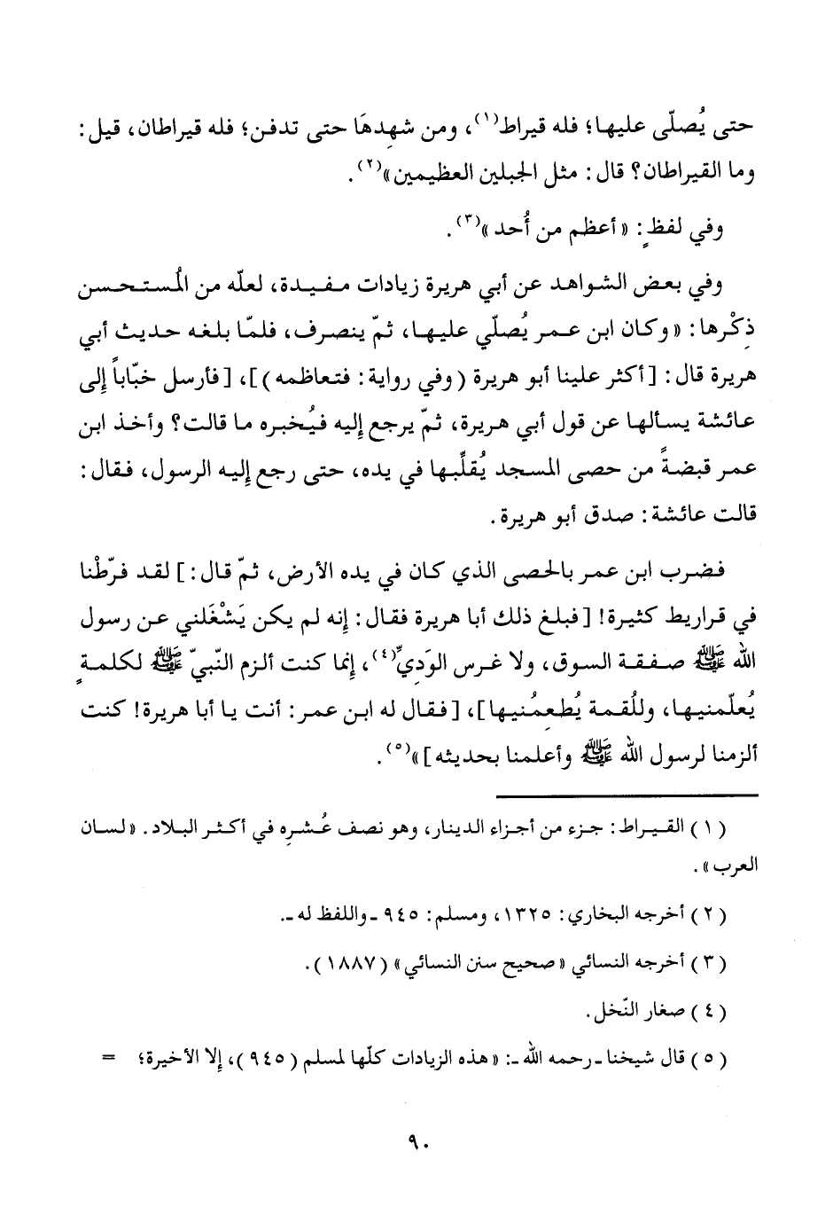 وفي بعض الشواهد عن أبي هريرة زيادات مفيدة، لعلّه من المُستحسن ذِكْرها: "وكان ابن عمر يُصلّي عليها، ثمّ ينصرف، فلمّا بلغه حديث أبي هريرة قال: [أكثر علينا أبو هريرة (وفي رواية: فتعاظمه)]، [فأرسل خبّاباً إِلى عائشة يسألها عن قول أبي هريرة، ثمّ يرجع إِليه فيُخبره ما قالت؟ وأخذ ابن عمر قبضةً من حصى المسجد يُقلِّبها في يده، حتى رجع إِليه الرسول، فقال: قالت عائشة: صدق أبو هريرة.