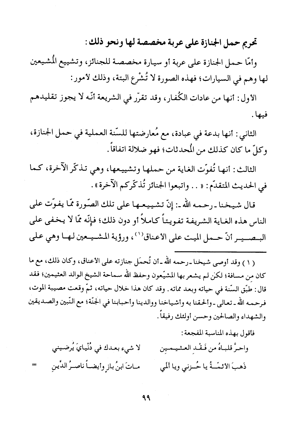 (¬1) وقد أوصى شيخنا -رحمه الله- أن تُحمَل جنازته على الأعناق، وكان ذلك، مع ما كان مِن مسافة؛ لكن لم يشعر بها المشيّعون وحفظ الله سماحة الشيخ الوالد العثيمين؛ فقد قال: طبّق السّنة في حياته وبعد مماته. وقد كان هذا خلال حياته، ثمّ وقعت مصيبة الموت، فرحمه الله -تعالى- وألحقنا به وأشياخنا ووالدينا وأحبابنا في الجنّة؛ مع النّبين والصديقين والشهداء والصالحين وحسن أولئك رفيقاً.
