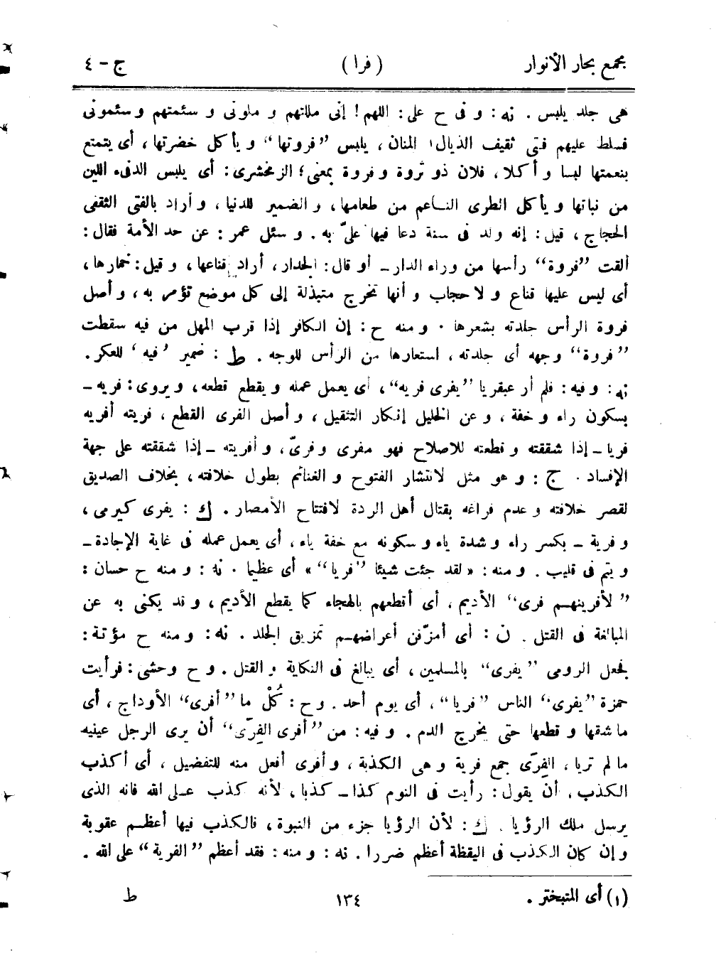 هي جلد يلبس. نه: وفي ح علي: اللهم! إني مللتهم وملوني وسئمتهم وسئموني فسلط عليهم فتى ثقيف الذيال المنان، يلبس "فروتها" ويأكل خضرتها، أي يتمتع بنعمتها لبسًا وأكلًا، فلان ذو ثروة وفروة بمعنى؛ الزمخشري: أي يلبس الدفئ اللين من نباتها ويأكل الطري الناعم من طعامها، والضمير للدنيا، وأراد بالفتى الثقفي الحجاج، قيل: إنه ولد في سنة دعا فيها عليّ به. وسئل عمر: عن حد الأمة فقال: ألقت "فروة" رأسها من وراء الدار- أو قال: الجدار، أراد قناعها، وقيل: خمارها، أي ليس عليها قناع ولا حجاب وأنها تخرج مبتذلة إلى كل موضع تؤمر به، وأصل فروة الرأس جلدته بشعرها. ومنه ح: إن الكافر إذا قرب المهل من فيه سقطت "فروة" وجهه أي جلدته، استعارها من الرأس للوجه. ط: ضمير "فيه" للعكر. نه: وفي: فلم أر عبقريًا "يفري فريه"، أي يعمل عمله ويقطع قطعه، ويروى: فريه- بسكون راء وخفة، وعن الخيل إنكار التثقيل، أصل الفري القطع، فريته أفريه فريًا- إذا شققته وقطعته للإصلاح فهو مفري وفريّ، وأفريته- إذا شققته على جهة الإفساد. ج: وهو مثل لإنتشار الفتوح والغنائم بطول خلافته، بخلاف الصديق لقصر خلافته وعدم فراغه بقتال أهل الردة لافتتاح الأمصار. ك: يفري كيرمي، وفرية- بكسر راء وشدة ياء وسكونه مع خفة ياء، أي يعمل عمله في غاية الإجادة- ويتم في قليب. ومنه: ((لقد جئت شيئًا "فريًا")) أي عظيمًا. نه: ومنه ح حسان: "لأفرينهم فري" الأديم، أي أقطعهم بالهجاء كما يقطع الأديم، وقد يكنى به عن المبالغة في القتل. ن: أي أمزّقن أعراضهم تمزيق الجلد. نه: ومنه ح مؤتة: فجعل الرومي "يفري" بالمسلمين، أي يبالغ في النكاية والقتل. وح وحشي: فرأيت حمزة "يفري" الناس "فريًا"، أي يوم أحد. وح: كُلْ ما "أفرى" الأوداج، أي ما شقها وقطعها حتى يخرج الدم. وفيه: من "أفرى الفِريّ" أن يرى الرجل عينيه ما لم تريا، الفِريّ جمع فرية وهي الكذبة، وأفرى أفعل منه للتفضيل، أي أكذب الكذب، أن يقول: رأيت في النوم كذا- كذبًا، لأنه كذب على الله فلأنه الذي يرسل ملك الرؤيا. ك: لأن الرؤيا جزء من النبوة، فالكذب فيها أعظم عقوبة وإن كان الكذب في اليقظة أعظم ضررًا. نه: ومنه: فقد أعظم "الفرية" على الله.