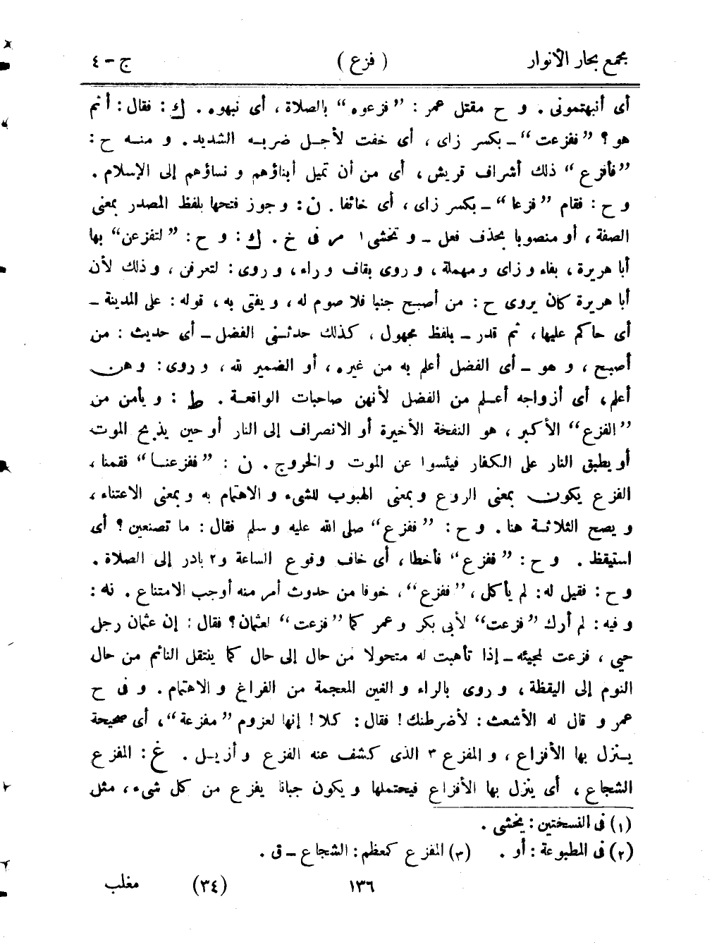 أي أنبهتموني. وح مقتل عمر: "فزعوه" بالصلاة، أي نبهوه. ك: فقال: أثم هو؟ "ففزعت"- بكسر زاي، أي خفت لأجل ضربه الشديد. ومنه ح: "فأفزع" ذلك أشراف قريش، أي من أن تميل أبناؤهم ونساؤهم إلى الإسلام. وح: فقام "فزعًا"- بكسر زاي، أي خائفًا. ن: وجوز فتحها بلفظ المصدر بمعنى الصفة، أو منصوبًا بحذف فعل- وتخشى مر في خ. ك: وح: "لتفزعن" بها أبا هريرة، بفاء وزاي ومهملة، وروى بقاف وراء، وروى: لتعرفن، وذلك لأن أبا هريرة كان يروى ح: من أصبح جنبًا فلا صوم له، ويفتى به، قوله: على المدينة- أي حاكم عليها، ثم قدر- بلفظ مجهول، كذلك حدثني الفضل- أي حديث: من أصبح، وهو- أي الفضل أعلم به من غيره، أو الضمير لله، وروى: وهن أعلم، أي أزواجه أعلم من الفضل لأنهن صاحبات الواقعة. ط: ويأمن من "الفزع" الأكبر، هو النفخة الأخيرة أو الانصراف إلى النار أو حين يذبح الموت أو يطبق النار على الكفار فيئسوا عن الموت والخروج. ن: "ففزعنا" فقمنا، الفزع يكون بمعنى الروع وبمعنى الهبوب للشيء والاهتمام به وبمعنى الاعتناء، ويصح الثلاثة هنا. وح: "ففزع" صلى الله عليه وسلم فقال: ما تصنعين؟ أي استيقظ. وح: "ففزع" فأخطأ، أي خاف وقوع الساعة وبادر إلى الصلاة. وح: فقيل له: لم يأكل، "ففزع"، خوفًا من حدوث أمر منه أوجب الامتناع. نه: وفيه: لم أرك "فزعت" لأبي بكر وعمر كما "فزعت" لعثمان؟ فقال: إن عثمان رجل حيي، فزعت لمجيئه- إذا تأهبت له متحولًا من حال إلى حال كما ينتقل النائم من حال النوم إلى اليقظة، وروى بالراء والغين المعجمة من الفراغ والاهتمام. وفي ح عمرو قال له الأشعث: لأضرطنك! فقال: كلا! إنها لعزوم "مفزعة"، أي صحيحة ينزل بها الأفزاع، والمفزع الذي كشف عنه الفزع وأزيل. غ: المفزع الشجاع، أي ينزل بها الأفزاع فيحتملها ويكون جبانًا يفزع من كل شيء، مثل