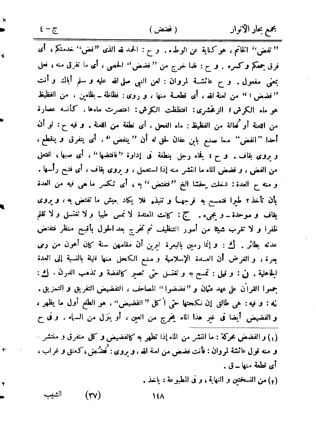 "تفض" الخاتم، هو كناية عن الوطء. وح: الحمد لله الذي "فض" خدمتكم، أي فرق جمعكم وكسره. وح: فلما خرج من "فضض" الحصى، أي ما تفرق منه، فعل بمعنى مفعول. وح عائشة لمروان: لعن النبي صلى الله عليه وسلم أباك وأنت "فضض" من لعنة الله، أي قطعة منها، وروى: فظاظة- بظاءين، من الفظيظ هو ماء الكرش؛ الزمخشري: افتظظت الكرش: اعتصرت ماءها، كأنه عصارة من اللعنة أو فُعالة من الفظيظ: ماء الفحل، أي نطفة من اللعنة. وفيه ح: لو أن أحدًا "انفض" مما صنع بابن عفان لحق له أن "ينفض"، أي يتفرق وينقطع، ويروى بقاف. وح: فجاء رجل بنطفة في إداوة "فافتضها"، أي صبها، افتعل من الفض، وفضض الماء ما انتشر منه إذا استعمل، ويروى بقاف، أي فتح رأسها. ومنه ح العدة: دخلت حِفشًا الخ "فتفتض" به، أي تكسر ما هي فيه من العدة بأن تأخذ طيرًا فتمسح به فرجها وتنبذه فلا يكاد يعيش ما تفتض به، ويروى بقاف وموحدة- ويجيء. ج: كانت المعتدة لا تمس طيبًا ولا تغتسل ولا تقلم ظفرًا ولا تقرب شيئًا من أمور التنظيف ثم تخرج بعد الحول بأقبح منظر فتفض عدته بطائر. ك: وإنما رمين بالبعرة ليرين أن مقامهن سنة كان أهون من رمي بعرة، والغرض أن العدة الإسلامية ومنع الكحل منها قليلة بالنسبة إلى العدة الجاهلية. ن: وقيل: تمسح به وتغتسل حتى تصير كالفضة وتذهب الدرن. ك: جمعوا القرآن على عهد عثمان و"فضضوا" المصاحف، التفضيض التفريق والتمزيق. نه: وفيه: هي طالق إن نكحتها حتى آكل "الفضيض"، هو الطلع أول ما يظهر، والفضيض أيضًا في غير هذا الماء يخرج من العين، أو ينزل من السماء. وفي ح
