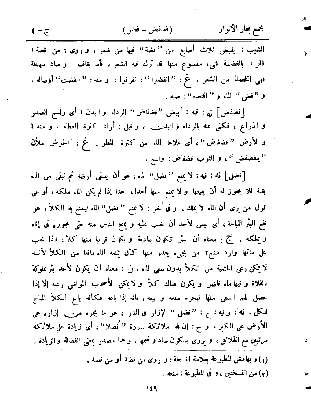 الشيب: يقبض ثلاث أصابع من "فضة" فيها من شعر، وروى: من قصة فالمراد بالفضة شيء مصنوع منها قد ترك فيه الشعر، فأما بقاف وصاد مهملة فهي الخصلة من الشعر. غ: "انفضوا": تفرقوا، ومنه: "انفضت" أوصاله. و"فض" الماء و"افتضه": صبه.
