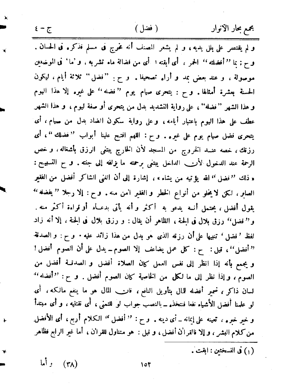 ولم يقتصر على بلل يديه، ولم يشعر المصنف أنه مخرج في مسلم فذكره في الحسان. وح: بما "أفضله" الحمر، أي أبقته أي من فضالة ماء تشربه، و "ما" في الموضعين موصولة، وعند بعض بمد وأراه تصحيفا. وح: "فضل" ثلاثة أيام، ليكون الحسنة بعشرة أمثالها. وح: يتحرى صيام يوم "فضله" على غيره إلا هذا اليوم وهذا الشهر "فضله"، على رواية التشديد بدل من يتحرى أو صفة ليوم، وهذا الشهر عطف على هذا اليوم باعتبار أيامه، وعلى رواية سكون الضاد بدل من صيام، أي يتحرى فضل صيام يوم على غيره. وح: اللهم افتح علينا أبواب "فضلك"، أي رزقك، خصه عند الخروج من المسجد لأن الخارج يبتغي الرزق بأشغاله، وخص الرحمة عند الدخول لأن الداخل يبتغي برحمته ما يزلفه إلى جنته. وح: التسبيح: «ذلك "فضل" الله يؤتيه من يشاء»، إشارة إلى أن الغني الشاكر أفضل من الفقير الصابر، لكن لا يخلو من أنواع الخطر والفقير أمن منه. وح: إلا رجلا "يفضله" يقول أفضل، يحتمل أنه يدعو به أكثر وأنه يأتي بدعاء أو قراءة أكثر منه. و"فضل" رزق بلال في الجنة، الظاهر أن يقال: ورزق بلال في الجنة، إلا أنه زاد لفظ "فضل" تنبيها على أن رزقه الذي هو بدل من هذا زائد عليه. وح: والصدقة "أفضل"، قيل: ح: كل عمل يضاعف إلا الصوم - يدل على أن الصوم أفضل! ويجمع بأنه إذا نظر إلى نفس العمل كان الصلاة أفضل والصدقة أفضل من الصوم، وإذا نظر إلى ما لكل من الخاصية كان الصوم أفضل. وح: "أفضله" لسان ذاكر، ضمير أفضله للمال بتأويل النافع، فإن المال هو ما ينفع مالكه، أي لو علمنا أفضل الأشياء نفعا فنتخذه - بالنصب جواب لو للتمني، أي نقتنيه، وأي مبتدأ وخير خبره، تعينه على إيمانه - أي دينه. وح: "أفضل" الكلام أربع، أي الأفضل من كلام البشر، وإلا فالقرآن أفضل، وقيل: هو متناول للقرآن، أما غير الرابع فظاهر