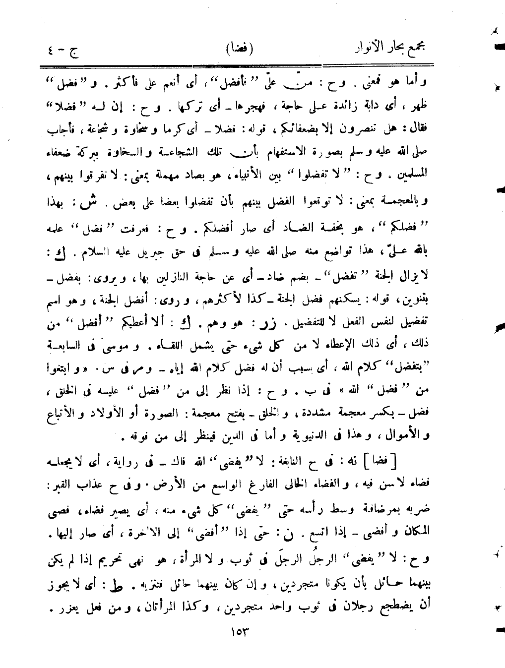[فضا] نه: في ح النابغة: لا "يفضي" الله فاك - في رواية، أي لا يجعله فضاء لا سن فيه، والفضاء الخالي الفارغ الواسع من الأرض، وفي ح عذاب القبر: ضربه بمرضافة وسط رأسه حتى "يفضي" كل شيء منه، أي يصير فضاء، فضى المكان وأفضى - إذا اتسع. ن: حتى إذا "أفضى" إلى الآخرة، أي صار إليها. وح: لا "يفضي" الرجلُ الرجلَ في ثوب ولا المرأة، هو نهي تحريم إذا لم يكن بينهما حائل بأن يكونا متجردين، وإن كانا بينهما حائل فتنزيه. ط: أي لا يجوز أن يضطجع رجلان في ثوب واحد متجردين، وكذا المرأتان، ومن فعل يعزر.