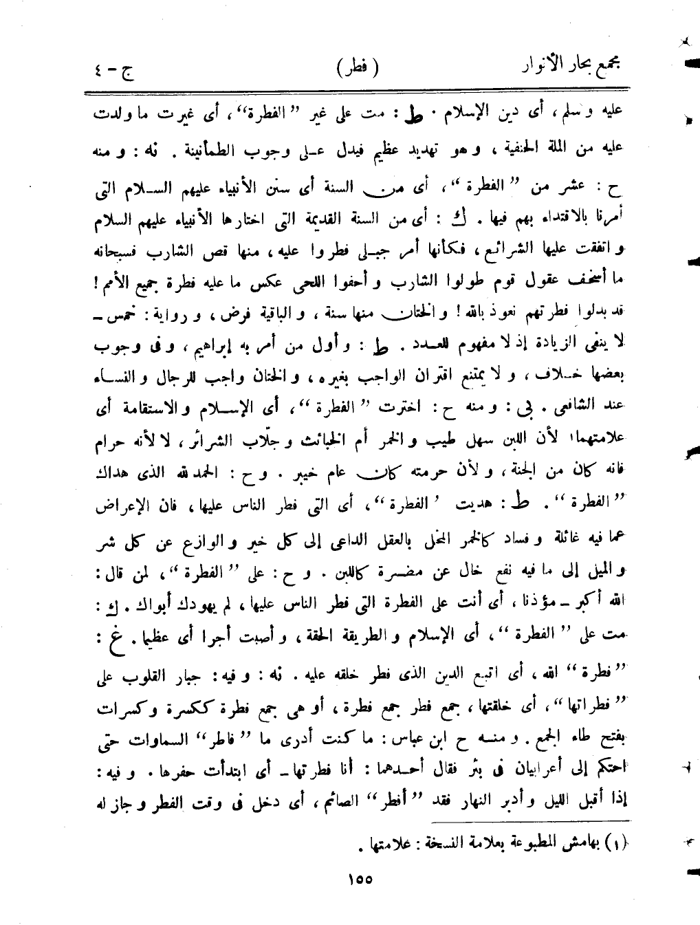 عليه وسلم، أي دين الإسلام. ط: مت على غير "الفطرة"، أي غيرت ما ولدت عليه من الملة الحنفية، وهو تهديد عظيم فيدل على وجوب الطمأنينة. نه: ومنه ح: عشر من "الفطرة"، أي من السنة أي سنن الأنبياء عليهم السلام التي أمرنا بالاقتداء بهم فيها. أبو بكر: أي من السنة القديمة التي اختارها الأنبياء عليهم السلام واتفقت عليها الشرائع، فكأنها أمر جبلي فطروا عليه، منها قص الشارب فسبحانه ما أسخف عقول قوم طولوا الشارب وأحفوا اللحى عكس ما عليه فطرة جميع الأمم! قد بلدوا فطرتهم نعوذ بالله! والختان منها سنة، والباقية فرض، ورواية: خمس - لا ينفي الزيادة إذ لا مفهوم للعدد. ط: وأول من أمر به إبراهيم، وفي وجوب بعضها خلاف، ولا يمتنع اقتران الواجب بغيره، والختان واجب للرجال والنساء عند الشافعي. بي: ومنه ح: اخترت "الفطرة"، أي الإسلام والاستقامة أي علامتهما، لأن اللبن سهل طيب والخمر أم الخبائث وجلاب الشرائر، لا لأنه حرام فإنه كان من الجنة، ولأن حرمته كان عام خيبر. وح: الحمد لله الذي هداك "الفطرة". ط: هديت "الفطرة". ط: هديت "الفطرة"، أي التي فطر الناس عليها، فإن الإعراض عما فيه غائلة وفساد كالخمر المخل بالعقل الداعي إلى كل خير والوازع عن كل شر والميل إلى ما فيه نفع خال عن مضرة كاللبن. وح: على "الفطرة"، لمن قال: الله أكبر - مؤذنا، أي أنت على الفطرة التي فطر الناس عليها، لم يهودك أبواك. ك: مت على "الفطرة"، أي الإسلام والطريقة الحقة، وأصبت أجرا أي عظيما. غ: "فطرة" الله، أي اتبع الدين الذين فطر خلقه عليه. نه: وفيه: جبار القلوب على "فطراتها"، أي خلقتها، جمع فطر جمع فطرة، أو هي جمع فطرة ككسرة وكسرات بفتح طاء الجمع. ومنه ح ابن عباس: ما كنت أدري ما "فاطر" السماوات حتى احتكم إلي أعرابيان في بئر فقال أحدهما: أنا فطرتها - أي ابتدأت حفرها. وفيه: إذا أقبل الليل وأدبر النهار فقد "أفطر" الصائم، أي دخل في وقت الفطر وجاز له