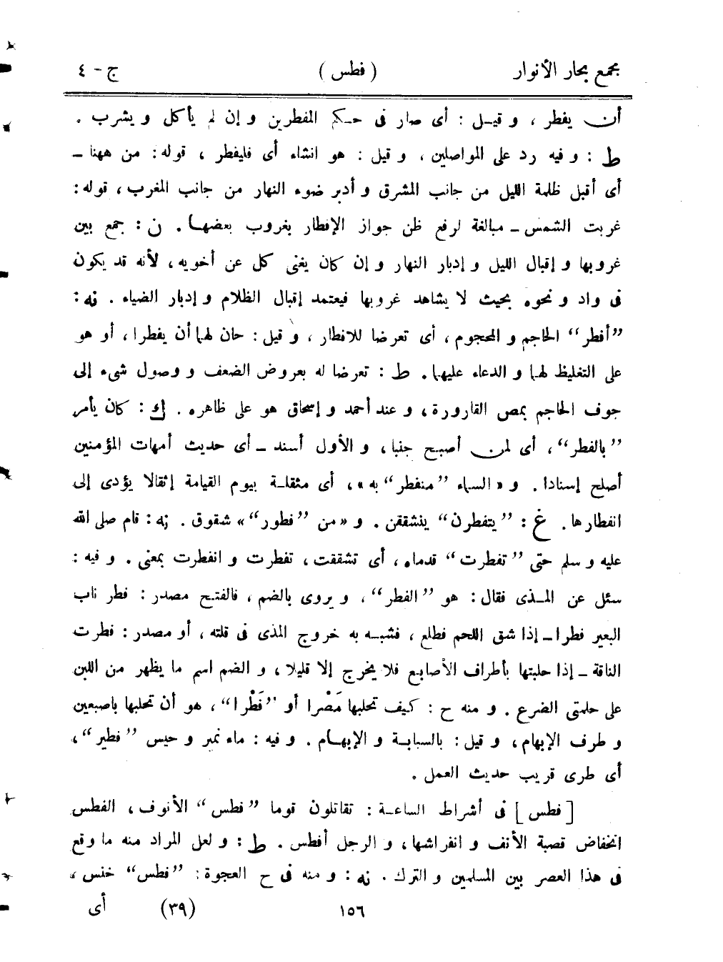 أن يفطر، وقيل: أي صار في حكم المفطرين وإن لم يأكل ويشرب. ط: وفيه رد على المواصلين، وقيل: هو إنشاء أي فليفطر، قوله: من ههنا- أي أقبل ظلمة الليل من جانب المشرق وأدبر ضوء النهار من جانب المغرب، قوله: غربت الشمس- مبالغة لرفع ظن جواز الإفطار بغروب بعضها. ن: جمع بين غروبها وإقبال الليل وإدبار النهار وإن كان يغني كل عن أخويه، لأنه قد يكون في واد ونحوه بحيث لا يشاهد غروبها فيعتمد إقبال الظلام وإدبار الضياء. نه: "أفطر" الحاجم والمحجوم، أي تعرضا للإفطار، وقيل: حان لهما أن يفطرا، أو هو على التغليظ لهما والدعاء عليهما. ط: تعرضا له بعروض الضعف ووصول شيء إلى جوف الحاجم بمص القارورة، وعند أحمد وإسحاق هو على ظاهره. ك: كان يأمر "بالفطر"، أي لمن أصبح جنبًا، والأول أسند- أي حديث أمهات المؤمنين أصلح إسنادًا. و"السماء "منفطر" به"، أي مثقلة بيوم القيامة إثقالًا يؤدي إلى انفطارها. غ: "يتفطرن" ينشققن. و"من" فطور"" شقوق. نه: قام صلى الله عليه وسلم حتى "تفطرت" قدماه، أي تشققت، تفطرت وانفطرت بمعنى. وفيه: سئل عن المذي فقال: "هو "الفطر"، ويروى بالضم، فالفتح مصدر: فطر ناب البعير فطرًا- إذا شق اللحم فطلع، فشبه به خروج المذي في قلته، أو مصدر: فطرت الناقة- إذا حلبتها بأطراف الأصابع فلا يخرج إلا قليلًا، والضم اسم ما يظهر من اللبن على حلمتي الضرع. ومنه ح: كيف تحلبها مَصْرا أو "فَطْرا"، هو أن تحلبها بإصبعين وطرف الإبهام، وقيل: بالسبابة والإبهام. وفيه: ماء نمير وحيس "فطير"، أي طري قريب حديث العمل.