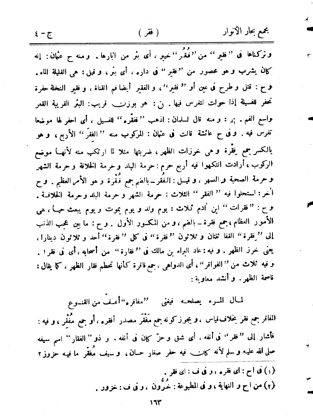 وتركناها في "فقير" من "فقر" خيبر، أي بئر من آباها. ومنه ح عثمان: إنه كان يشرب وهو محصور من "فقير" في داره، أي بئر، وقيل: هي القليلة الماء. وح: قتل وطرح في عين أو "فقر"، والفقير أيضًا فم القناة، وفقير النخلة حفرة تحفر للفسيلة إذا حولت لتغرس فيها. ن: هو بوزن قريب: البئر القريبة القعر واسع الفم. نه: ومنه قال لسلمان: اذهب "ففقره" للفسيل، أي احفر لها موضعا تغرس فيه. وفي ح عائشة قالت في عثمان: المركوب منه "الفقر" الأربع، وهو بالكسر جمع فقرة وهي خرزات الظهر، ضربتها مثلا لما ارتكب منه لأنها موضع الركوب، أرادت انتهكوا فيه أربع حرم: حرمة البلد وحرمة الخلافة وحرمة الشهر وحرمة الصحبة والصهر، وقيل: الفقر - بالضم جمع فقرة وهو الأمر العظيم. وح آخر: استحلوا فيه "الفقر" الثلاث: حرمة الشهر وحرمة البلد وحرمة الخلافة. وح: "فقرات" ابن آدم ثلاث: يوم ولد ويوم يموت ويوم يبعث حيا، هي الأمور العظام، جمع فقرة - بالضم، ومن المكسور الأول. وح: ما بين عجب الذنب إلى "فقرة" القفا ثنتان وثلاثون "فقرة" في كل "فقرة" أحد وثلاثون دينارا، يعين خرز الظهر. وفيه: عاد البراء بن مالك في "فقارة" من أصحابه، أي في فقر. وفيه ثلاث من "الفواقر"، أي الدواهي، جمع فاقرة كأنها تحطم فقار الظهر، كما يقال: قاصمة الظهر. وأنشد معاوية: