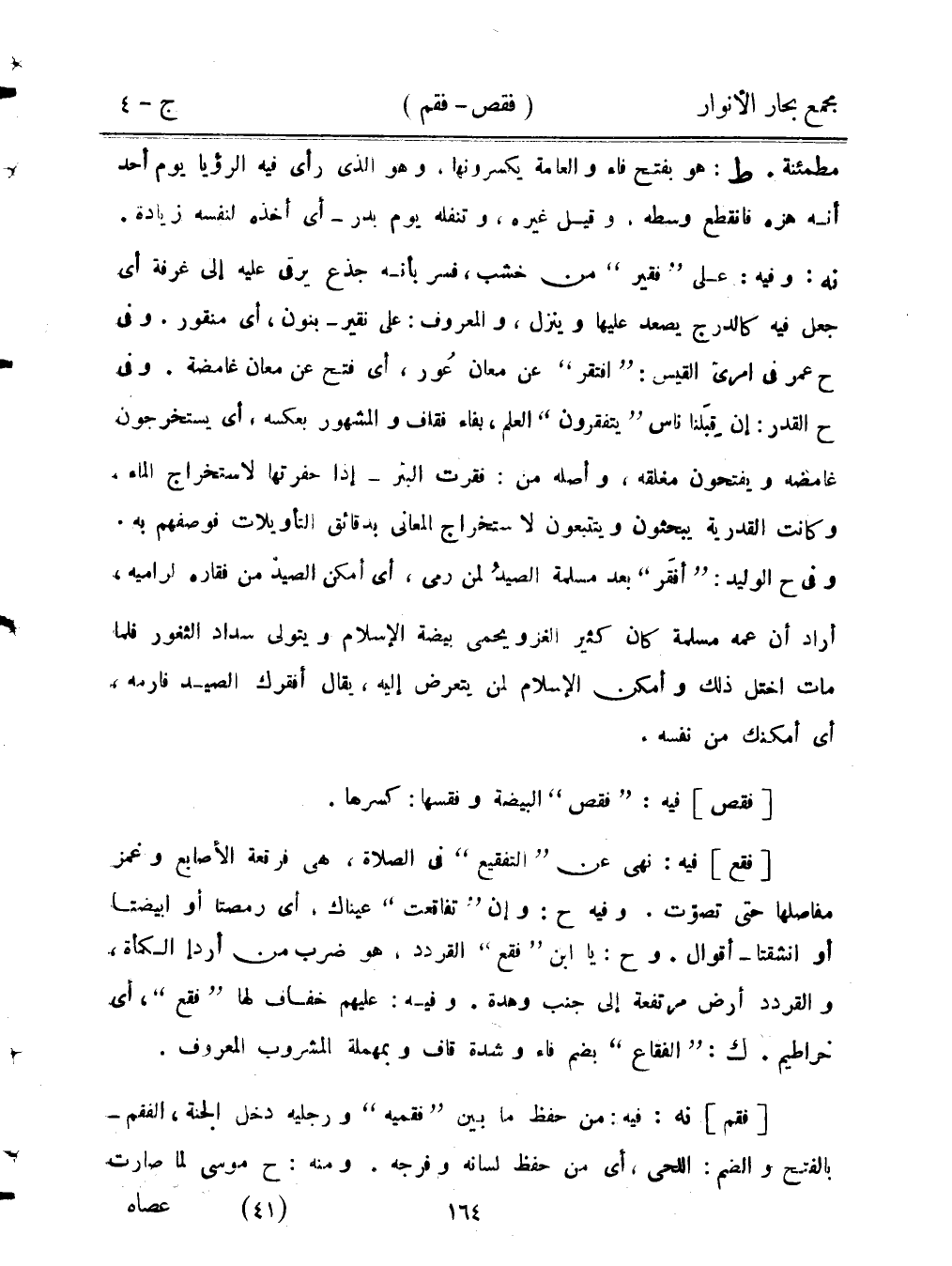 مطمئنة. ط: هو بفتح فاء والعامة يكسرونها، وهو الذي رأى فيه الرؤيا يوم أحد أنه هزه فانقطع وسطه. وقيل غيره، وتنفله يوم بدر - أي أخذه لنفسه زيادة. نه: وفيه: على "فقير" من خشب، فسر بأنه جذع يرقى عليه إلى غرفة أي جعل فيه كالدرج يصعد عليها وينزل، والمعروف: على نقير - بنون، أي منقور. وفي ح عمر في امرئ القيس: "افتقر" عن معان عور، أي فتح عن معان غامضة. وفي ح القدر: إن قبلنا ناس "يتفقرون" العلم، بفاء فقاف والمشهور بعكسه، أي يستخرجون غامضة ويفتحون مغلفة، وأصله من: فقرت البئر - إذا حفرتها لاستخراج الماء، وكانت القدرية يبحثون ويتتبعون لاستخراج المعاني بدقائق التأويلات فوصفهم به. وفي ح الوليد: "أفقر" بعد مسلمة الصيد لمن رمى، أي أمكن الصيد من فقاره لراميه، أراد أن عمه مسلمة كان كثير الغزو ويحمي بيضة الإسلام ويتولى سداد الثغور فلما مات اختل ذلك وأمكن الإسلام لمن يتعرض إليه، يقال أفقرك الصيد فارمه، أي أمكنك من نفسه.