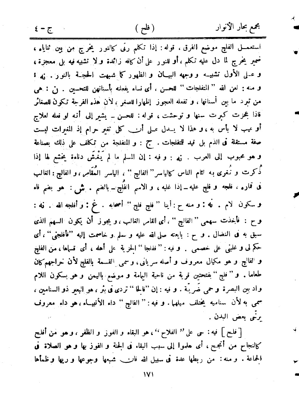 استعمل الفلج موضع الفرق، قوله: إذا تكلم ربي كالنور يخرج من بين ثناياه، ضمير يخرج لما دل عليه تكلم، أو للنور على أن كافه زائدة ولا تشبيه فيه بل معجزة، وعلى الأول تشبيه ووجهه البيان والظهور كما شبهت الحجة بالنور. نه: ومنه: لعن الله "المتفلجات" للحسن، أي نساء يفعلنه بأسنانهن للتحسين. ن: هي من تبرد ما بين أسنانها، وتفعله العجوز إظهارا للصغر، لأن هذه الفرجة تكون للصغائر فإذا عجزت كبرت سنها وتوحشت، قوله: للحسن - يشير إلى أنه لو فعله لعلاج أو عيب لا بأس به، وهذا لا يدل على أن كل تغير حرام إذ المغيرات ليست صفة مستقلة في الدم بل قيد للمتفلجات. ج: والمتفلجة من تكلف على ذلك بصناعة وهو محبوب إلى العرب. نه: وفيه: إن المسلم ما لم يغش دناءة يخشع لها إذا ذكرت وتغرى به لئام الناس كالياسر "الفالج"، الياسر المقامر، والفالج: الغالب في قماره، فلجه وفلج عليه - إذا غلبه، والاسم الفلج - بالضم. ش: هو بضم فاء وسكون لام. نه: ومنه ح: أينا "فلج فلج" أصحابه. غ: وأفلجه الله. نه: وح: فأخذت سهمي "الفالج"، أي القامر الغالب، ويجوز أن يكون السهم الذي سبق به في النضال. وح: بايعته صلى الله عليه وسلم وخاصمت إليه "فأفلجني"، أي حكم لي وغلبني على خصمي. وفيه: "ففلجا" الجزية على أهله، أي قسماها، من الفلج والفالج وهو مكيال معروف وأصله سرياني، وسمى القسمة بالفلج لأن خراجهم كان طعاما. و "فلج" بفتحتين قرية من ناحية اليمامة وموضع باليمن وهو بسكون اللام واد بين البصرة وحمى ضرية. وفيه: إن "فالجا" تردى في بئر، هو البعير ذو السنامين، سمي به لأن سناميه يختلف ميلهما. وفيه: "الفالج" داء الأنبياء، هو داء معروف يرخى بعض البدن.