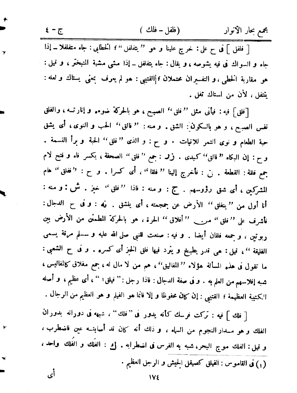 [فلق] فيه: فيأتي "فقل" الصبح، هو بالحركة ضوءه وإنارته، والفلق نفس الصبح، وهو بالسكون: الشق. ومنه: "فالق" الحب والنوى، أي يشق حبة الطعام ونوى التمر للإنبات. وح: والذي "فلق" الحبة وبرأ النسمة. وح: إن البكاء "فالق" كبدي. زر: جمع "فلق" الصحفة، بكسر فاء وفتح لام جمع فلقة: القطعة. ن: فأخرج إلينا "فلقا"، أي كسرا. وح: "ففلق" هام المشركين، أي شق رؤوسهم. ج: ومنه: فإذا "فلق" خبز. ش: ومنه: أنا أول من "ينفلق" من "أفلاق" الحرة، هو بالحركة المطمئن من الأرض بين ربوتين، وجمعه فلقان أيضًا. وفيه: صنعت للنبي صلى الله عليه وسلم مرقة يسمى الفليقة. يقل: هي قدر يطبخ ويثرد فيها فلق الخبز أي كسره. وفي ح الشعبي: ما تقول في هذه المسألة هؤلاء "المفاليق"، هم من لا مال له، جمع مفلاق كالمفاليس، شبه إفلاسهم من العلم به. وفي صفة الدجال: فإذا رجل: "فيلق"، أي عظيم، وأصله الكتيبة العظيمة؛ القتيبي: إن كان محفوظا وإلا فإنما هو الفيلم وهو العظيم من الرجال.