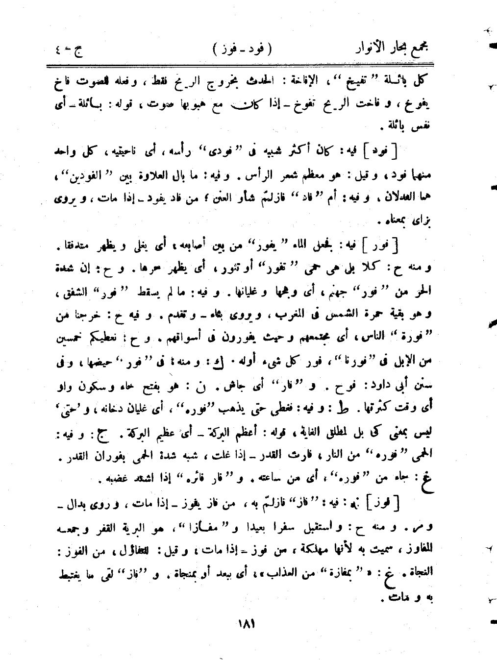 [فور] فيه: فجعل الماء "يفور " من بين أصابعه، أي يغلي، ويظهر متدفقا. ومنه ح: كلا بل هي حمى "تفور" أو تثور، أي يظهر حرها، وح: إن شدة الحر من "فور" جهنم، أي وهجها، وغليانها. وفيه: ما لم يسقط "فور" الشفق، وهو بقية حمرة الشمس في المغرب، ويروى بثاء - وتقدم. وفيه ح: خرجنا من "فورة" الناس، أي مجتمعهم وحيث يفورون في أسواقهم، وح: نعطيكم خمسين من الإبل في "فورنا"، فور كل شيء أوله. ك: ومنه: في" فور". حيضها، وفي سنن أبي داود: فوح. و "نار" أي جاش. ن: هو بفتح حاء وسكون الواو أي وقت كثرتها. ط: وفيه: فغطى حتى يذهب "فوده"، أي غليان دخانه، "حتى" ليس بمعنى كي بل لمطلق الغاية، قوله: أعظم البركة -أي عظيم البركة. ج: وفيه: الحمى: "فوره" من النار، فارث القدر - إذا غلت، شبه شدة الحمى بفوران القدر. غ: جاء من "فوره"، أي من ساعته، و "فار فائره" إذا اشتد غضبه.