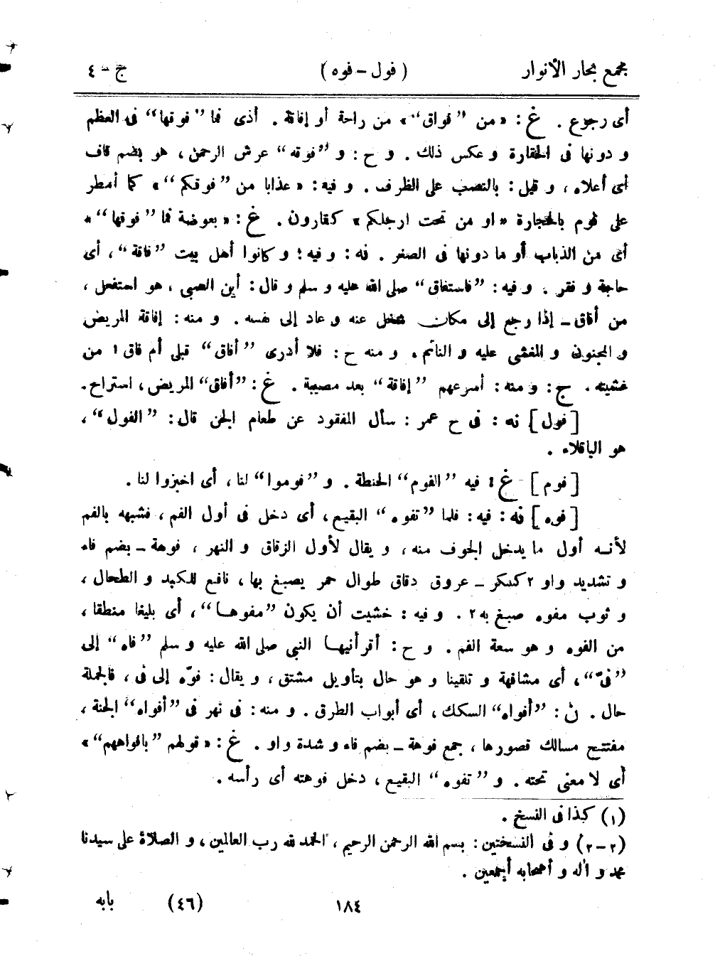 [فوه] نه: فيه: فلما "تفوه" البقيع، أي دخل في أول الفم، فشبهه بالفم لأنه أول ما يدخل الجوف منه، ويقال لأول الزقاق والنهر، فوهة -بضم فاء وتشديد واو كسكر - عروف دقاق طوال حمر يصبغ بها، نافع للكبد والطحال، وثوب مفوه صبغ به. وفيه خشيت أن يكون "مفوها"، أي بليغ منطقا من الفوه وهو سعة الفم. وح: أقرأنيها النبي صلى الله عليه وسلم "فاه" إلى "في"، أي مشافهة وتلقينا وهو حال بتأويل مشتق، ويقال: فوه إلى في، فالجملة مفتتح مسالك قصورها، جمع فوهة -بضم فاء وشدة واو. غ: «قولهم " بأفواههم"». أي لا معنى تحته. و "تفوه" البقيع، دخل فوهته أي رأسه.