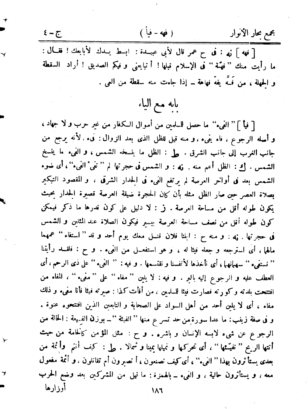 [فيأ] "الفيء" ما حصل للمسلمين من أموال الكفار من غير حرب ولا جهاد، وأصله الرجوع، فاء يفئ، ومنه قيل للظل الذي بعد الزوال: فئ، لأنه يرجع من جانب الغرب إلى جانب الشرق. ط: الظل ما ينسخه الشمس، والفيء، ما ينسخ الشمس. ك: الظل أعم منه. نه: والشمس في حجرتها لم "تفئ الفيء"، أي ضوء الشمس بعد في أواخر العرصة لم يرتفع الفيء في الجدار الشرقي، والمقصود التبكير بصلاة العصر حين صار الظل مثله بأن كان الحجرة ضيقة العرصة قصيرة الجدار بحيث يكون طوله أقل من مساحة العرصة. ز: لا دليل على كون قدرها ما ذكر فيمكن كون طوله أقل من نصف مساحة العرصة بيسير فيكون الصلاة عند المثلين والشمس في حجرتها. نه: ومنه ح: ابنتا فلان قتل معك يوم أحد وقد "استفاء" عمهما ما لهما، أي استرجعه وجعله فيئا له، وهو استفعل من الفيء. وح: فلقد رأيتنا "نستفئ" سهمانهما، أي نأخذها لأنفسنا ونقتسمها. وفيه: "الفيء" على ذي الرحم، أي العطف عليه والرجوع إليه بالبر. وفيه: لا يلي "مفاء" على" مفيء"، المفاء من افتتحت بلدته وكورته فصارت فيئا للمسلمين، من أفأت كذا: صيرته فيئا فأنا مفئ، وذلك مفاء، أي لا يلين أحد من أهل السواد على الصحابة والتابعين الذين افتتحوه عنوه. وفي صفة زينب: ما عدا سورة من حد تسرع منها "الفيئة" -بوزن الفيعة: الحالة من الرجوع عن شيء لا بسه الإنسان وباشره. وح: مثل المؤمن كالحامة من حيث أتتها الريح "تفئها"، أي تحركها وتميلها يمينا وشمالا. ط: كيف أنتم وأئمة من بعدي يستأثرون بهذا "الفيء"، أي كيف تصنعوا، أتصبرون أم تقاتلون، وأئمة مفعول معه، ويستأثرون حالية، والفيء - بالهمزة: ما نيل من المشركين بعد وضع الحرب