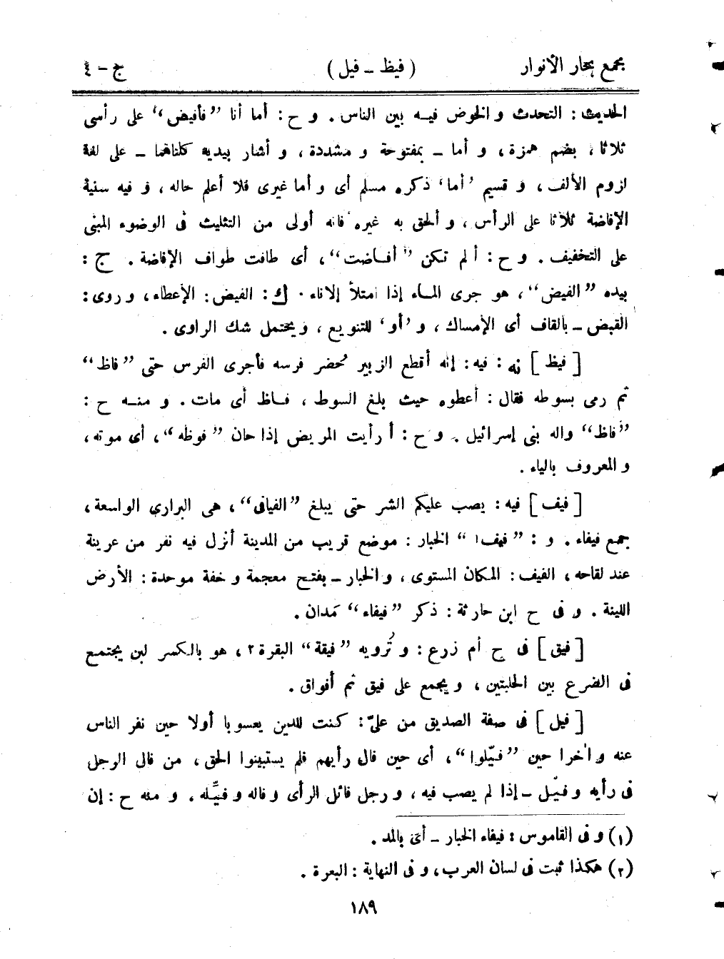 الحديث: التحدث والخوض فيه بين الناس. وح: أما أنا "فأفيض" على رأسي ثلاثًا، بضم همز، وأما- بمفتوحة ومشددة، وأشار بيديه كلناهما - على لغة لزوم الألف، وقسيم "أما" ذكره مسلم أي وأما غيري فلا أعلم حاله، وفيه سنية الإفاضة ثلاثا على الرأس، وألحق به غيره فإنه أولى من التثليث في الوضوء المبني على التخفيف. وح: ألم تكن "أفاضت"، أي طافت طواف الإفاضة. ج: بيده "الفيض"، هو جرى الماء إذا امتلأ الإناء. ك: الفيض: الإعطاء وروى: القبض -بالقاف أي الإمساك، و "أو" للتنويع، ويحتمل شك الراوي.
